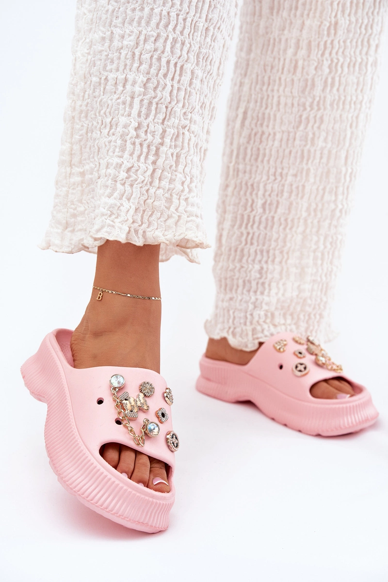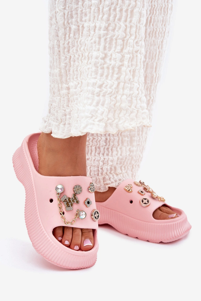 Piankowe Klapki Damskie Ze Złotymi Przypinkami Różowe Hortiana