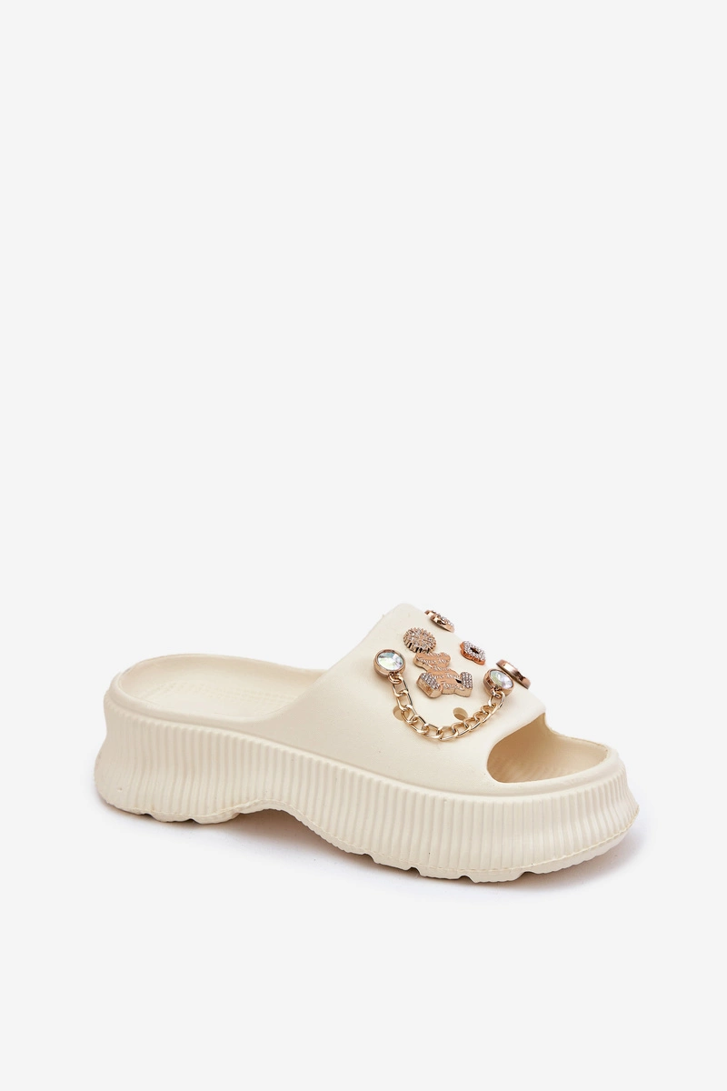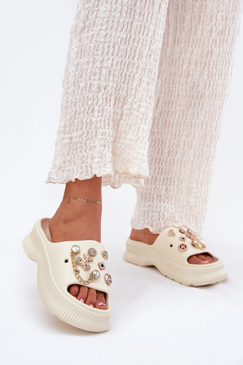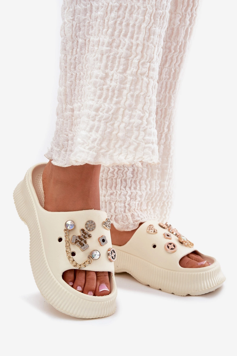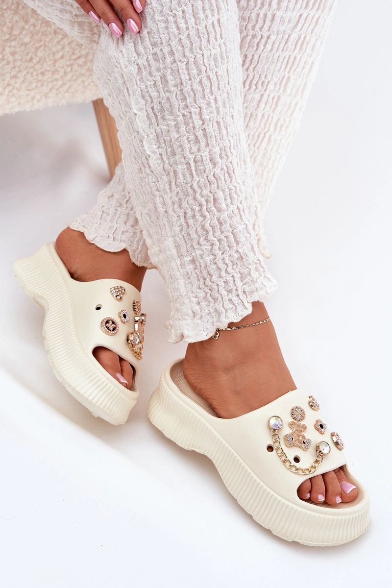 Piankowe Klapki Damskie Ze Złotymi Przypinkami Jasnobeżowe Hortiana