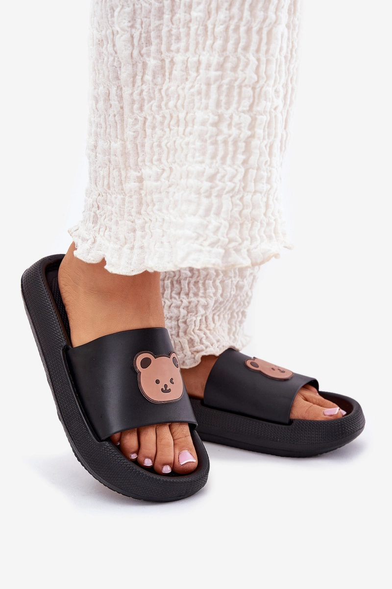 Damskie Piankowe Klapki Z Misiem Czarne Lalon