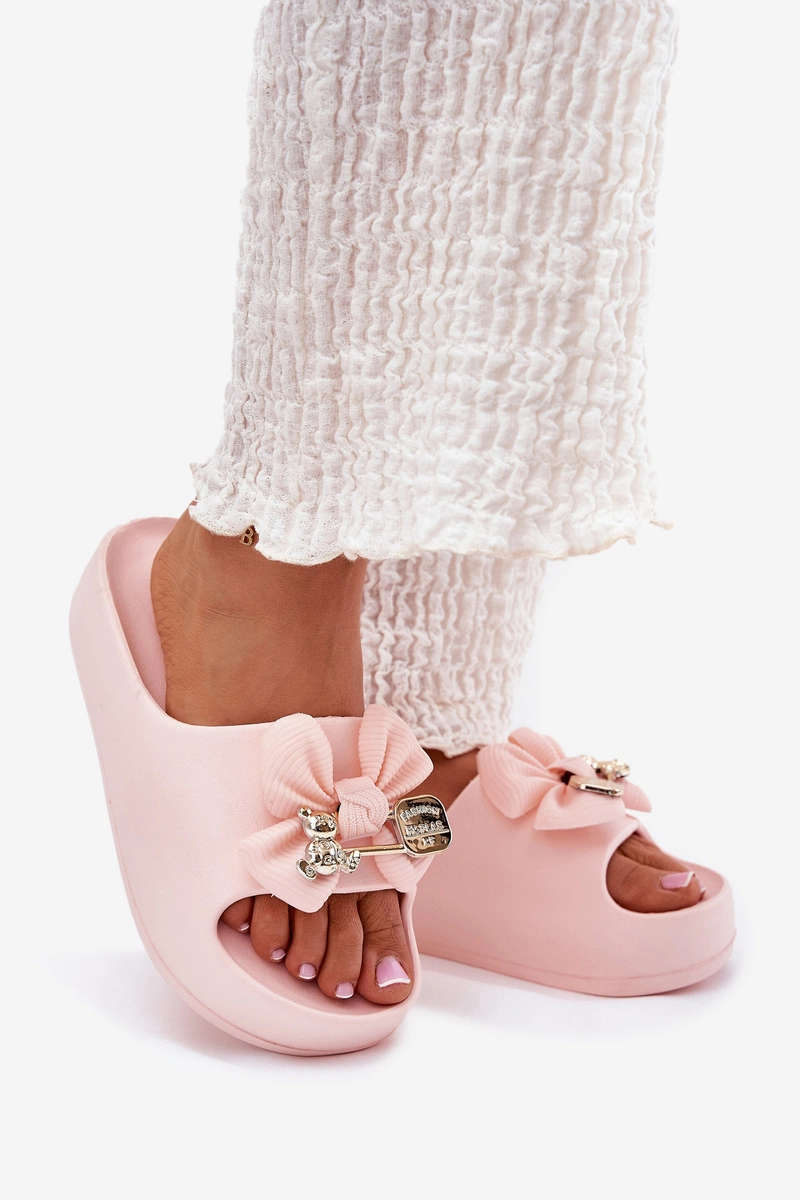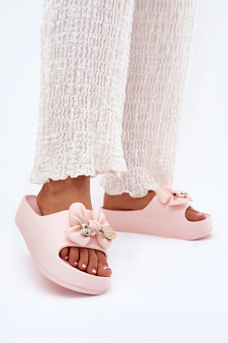 Klapki Damskie Piankowe Na Platformie Z Kokardką I Broszką Różowe Marlize