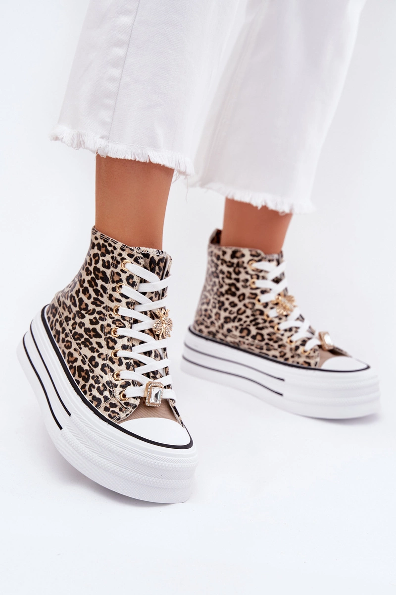 Trampki Damskie Wysokie Na Masywnej Platformie Z Przypinkami Panterka Złote Olivana