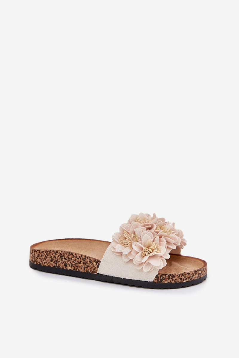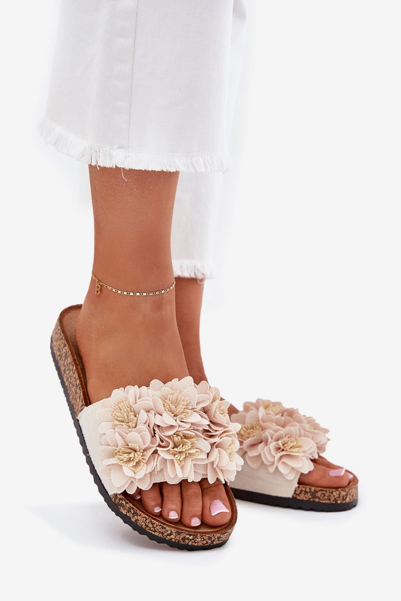 Klapki Damskie Na Korkowej Podeszwie Z Kwiatkami Beżowe Ferenza