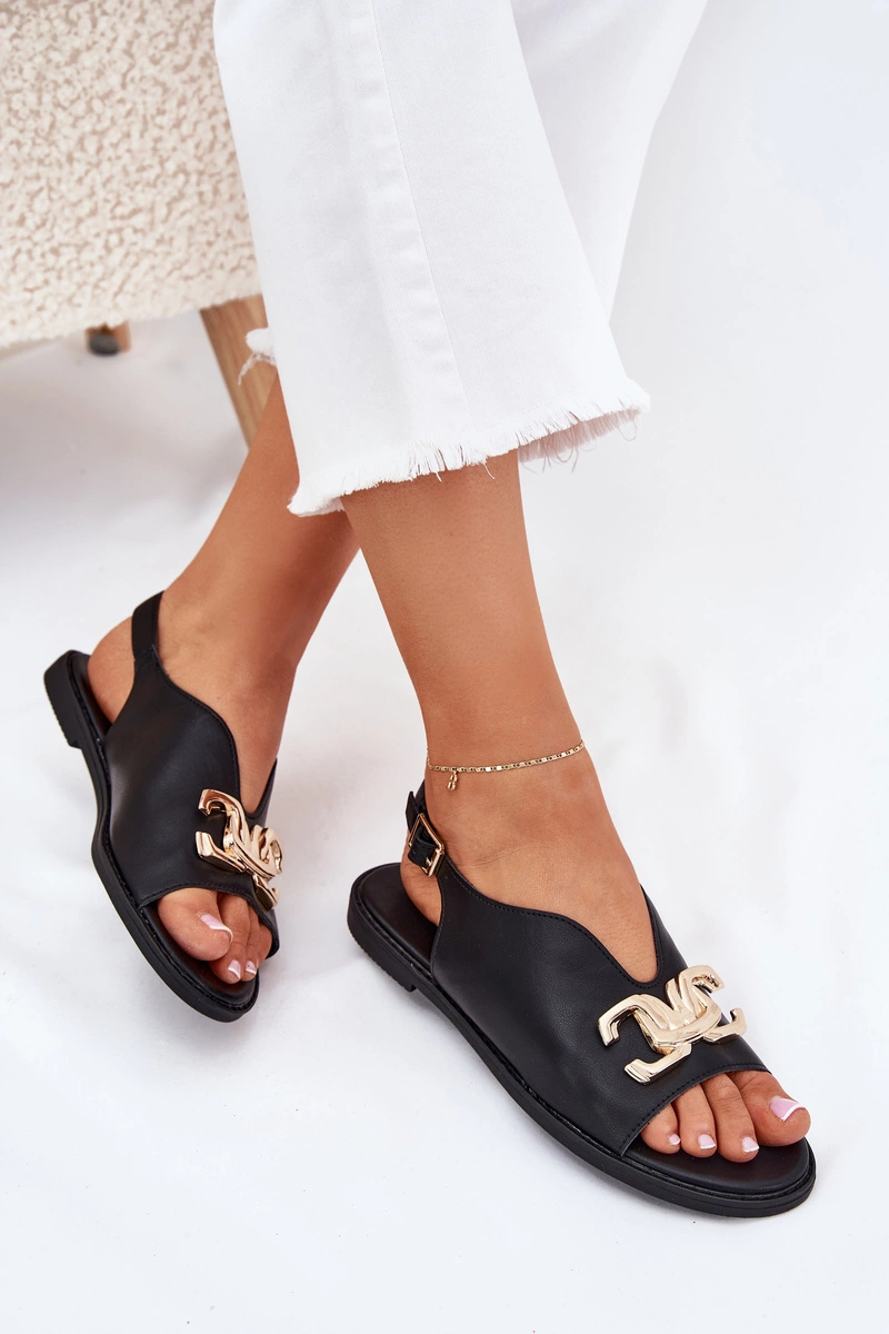 Sandały Damskie Na Płaskim Obcasie Ze Złotą Ozdobą Czarne Amelira