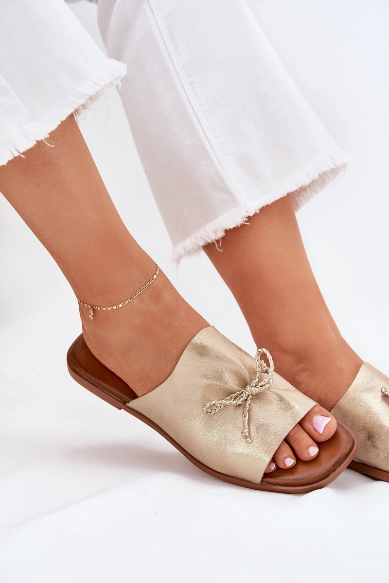Klapki Damskie Na Płaskim Obcasie Z Ozdobnym Wiązaniem Złote Norela