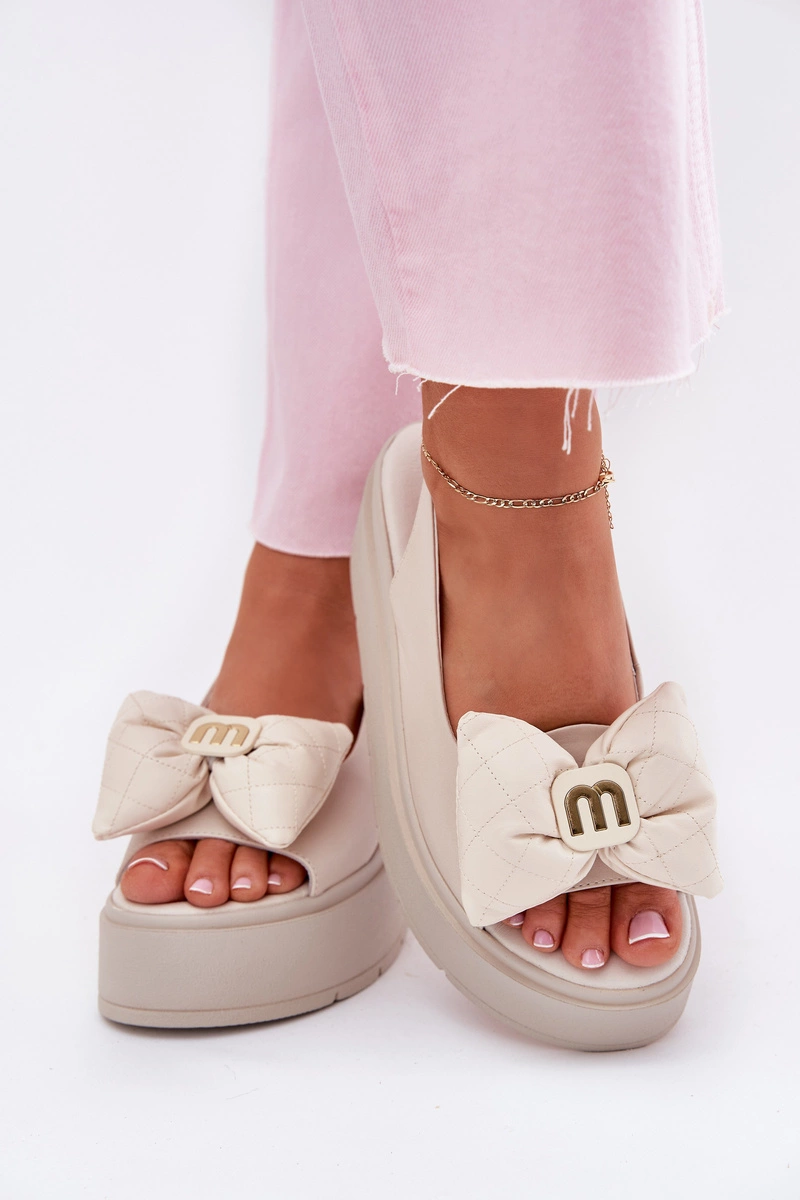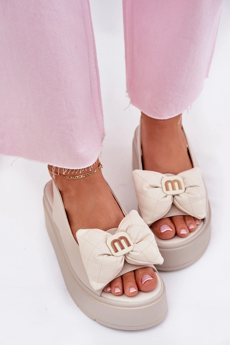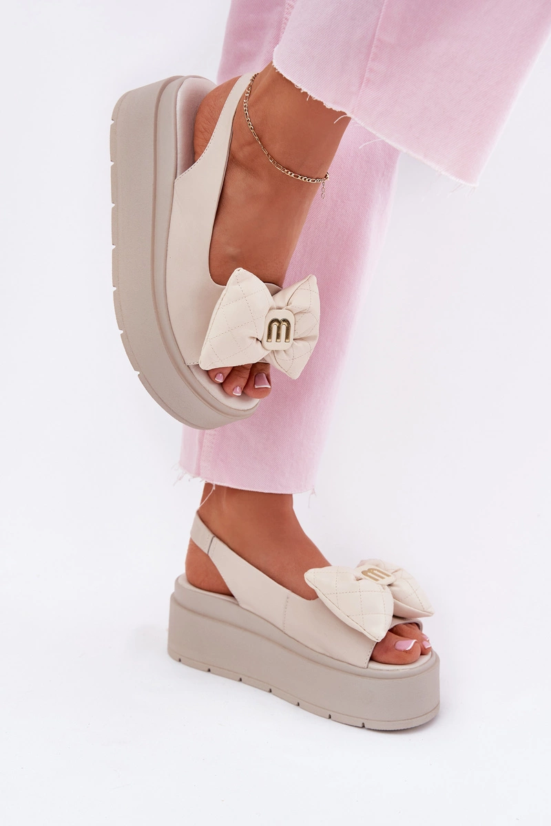 Skórzane Sandały Damskie Na Platformie Z Kokardą CheBello 4641 Beżowe