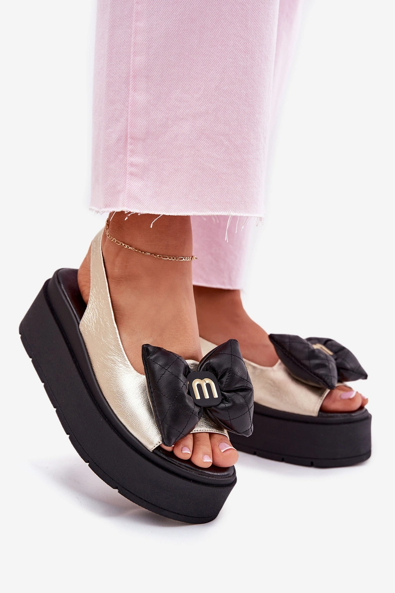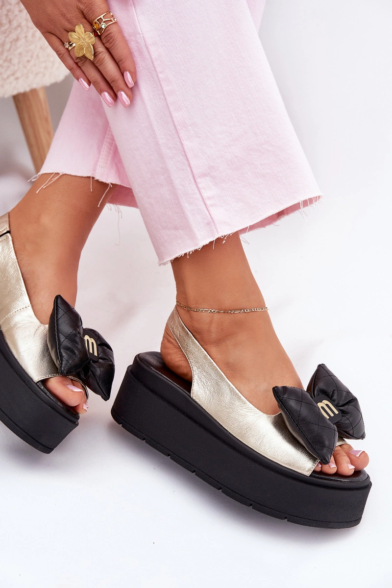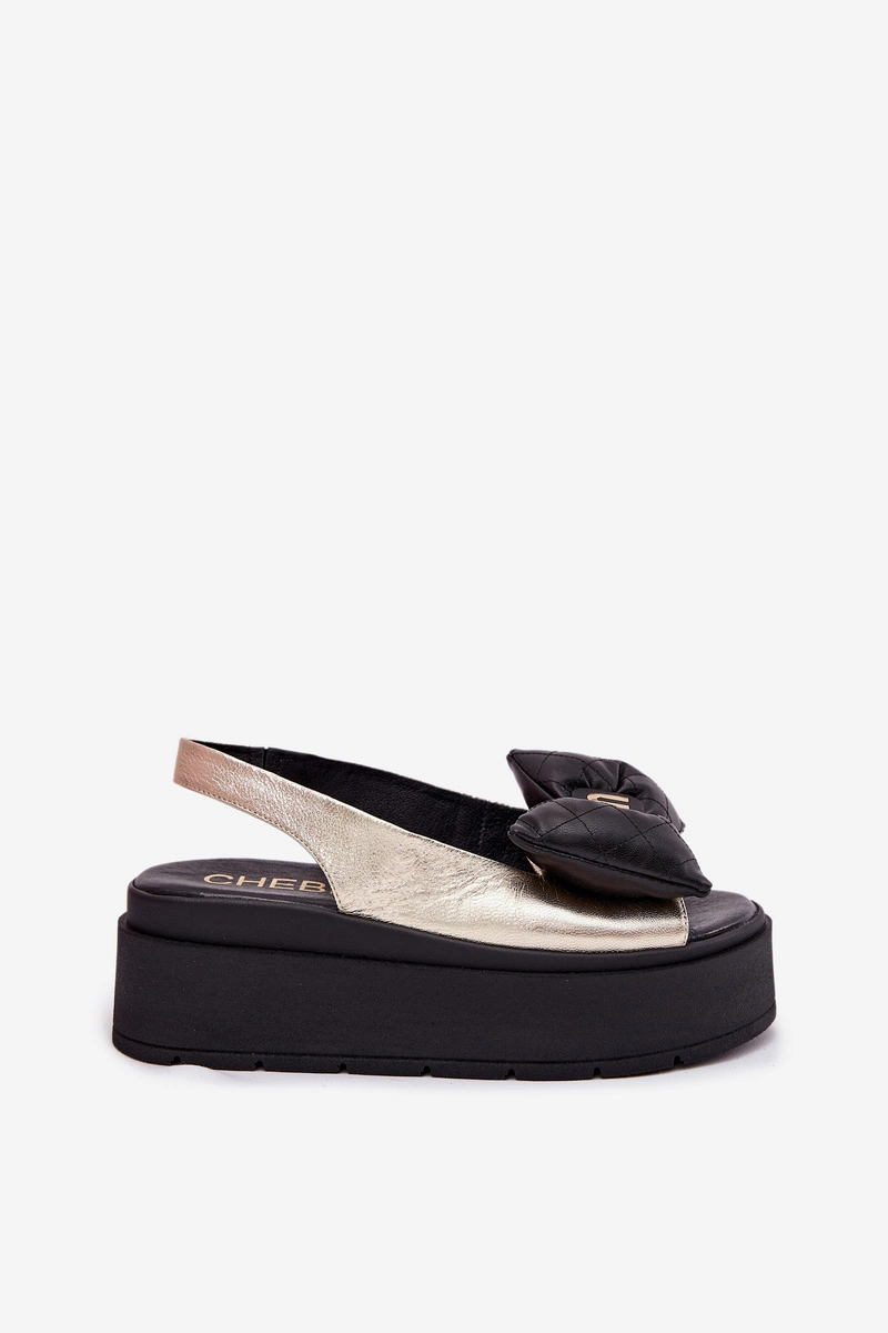 Skórzane Sandały Damskie Na Platformie Z Kokardą CheBello 4641 Złoto-Czarne