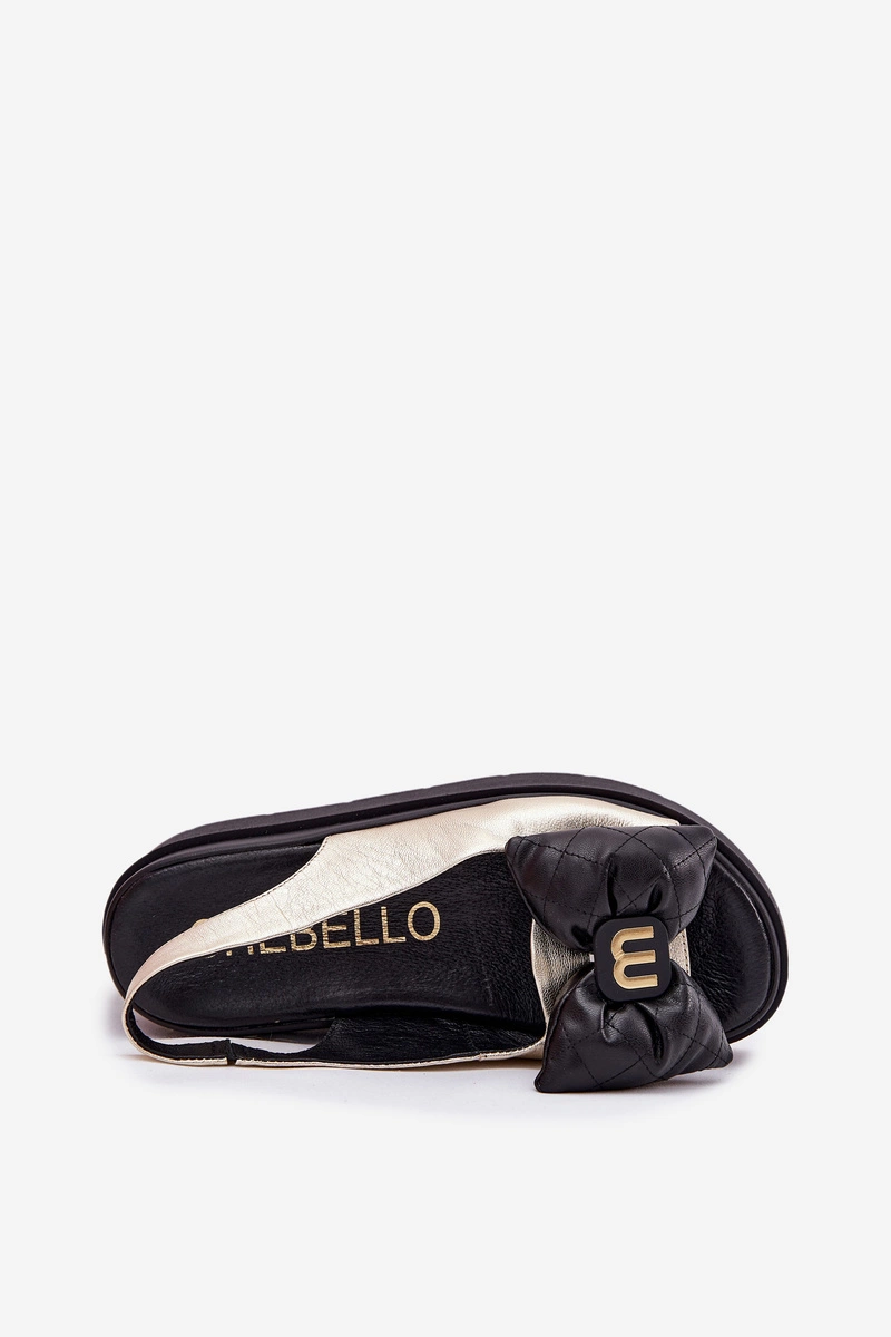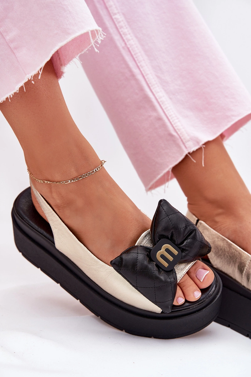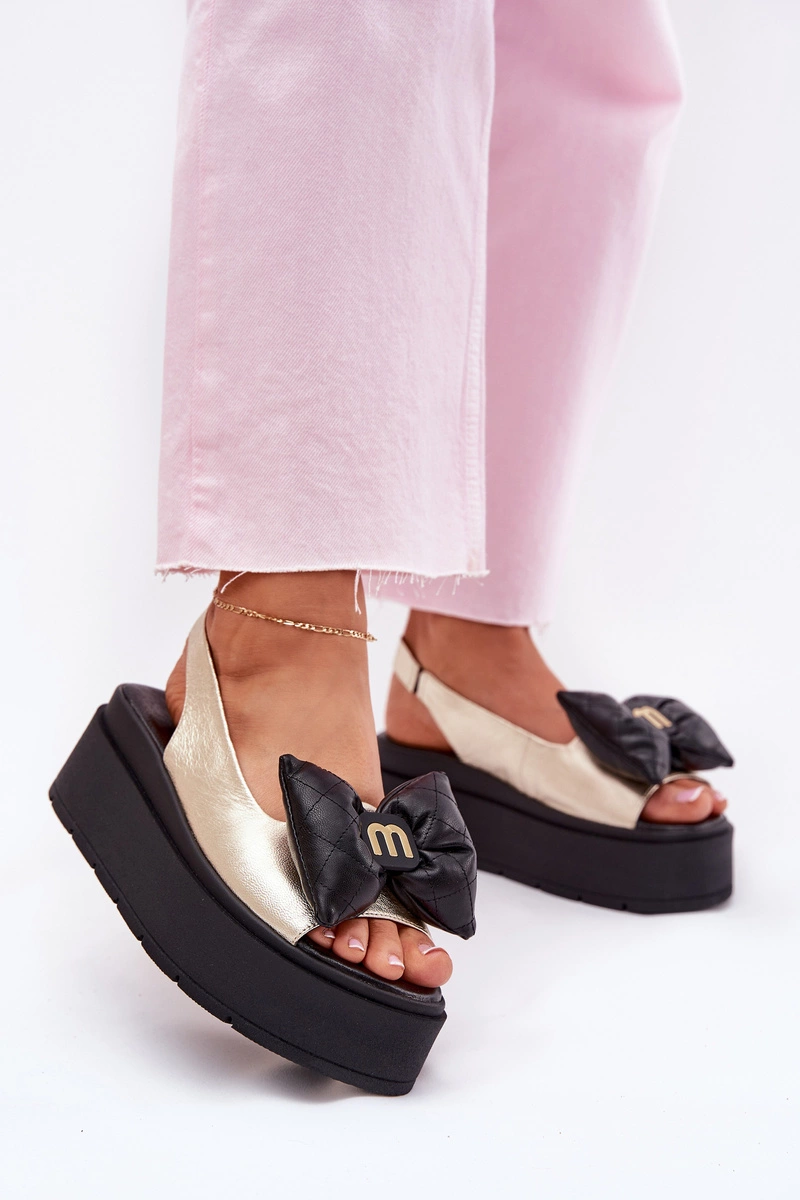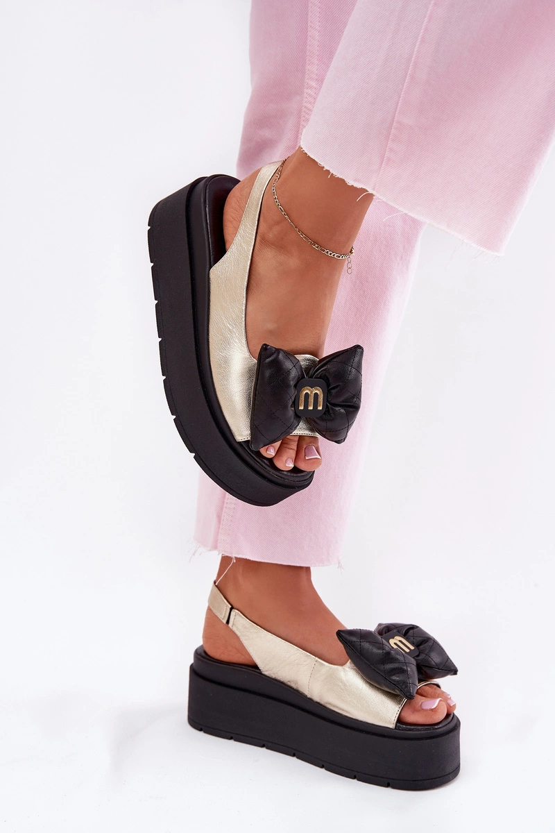 Skórzane Sandały Damskie Na Platformie Z Kokardą CheBello 4641 Złoto-Czarne