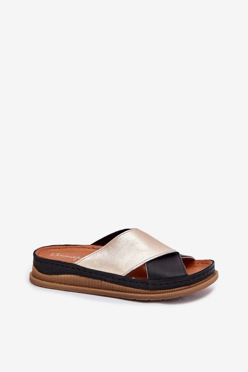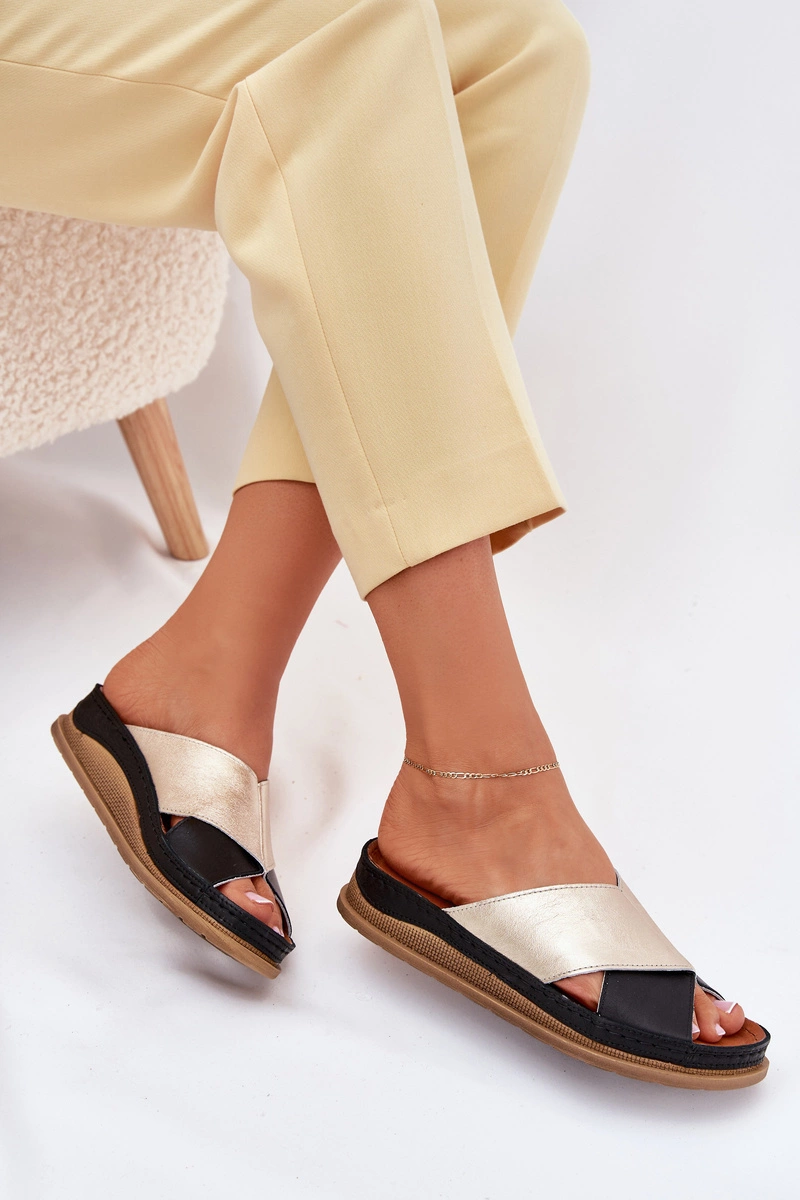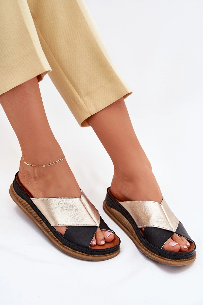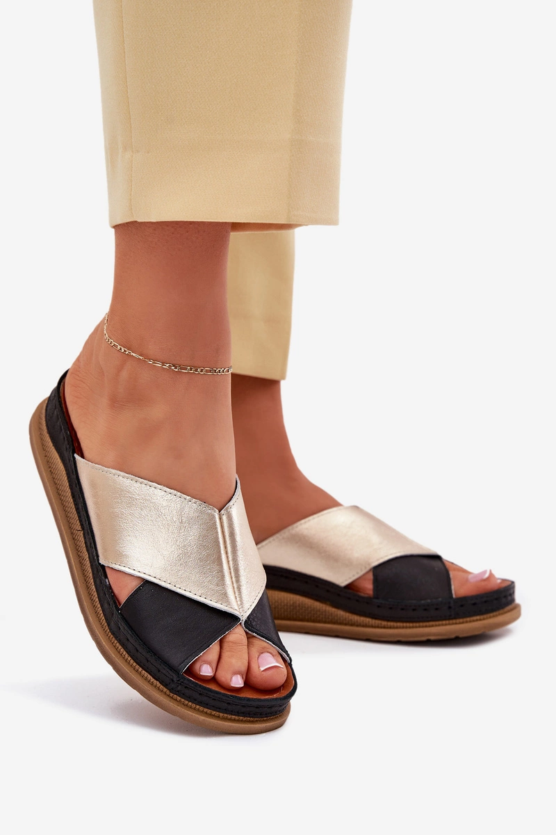 Skórzane Klapki Damskie Na Platformie Maciejka L4986-25 Złoto-Czarne