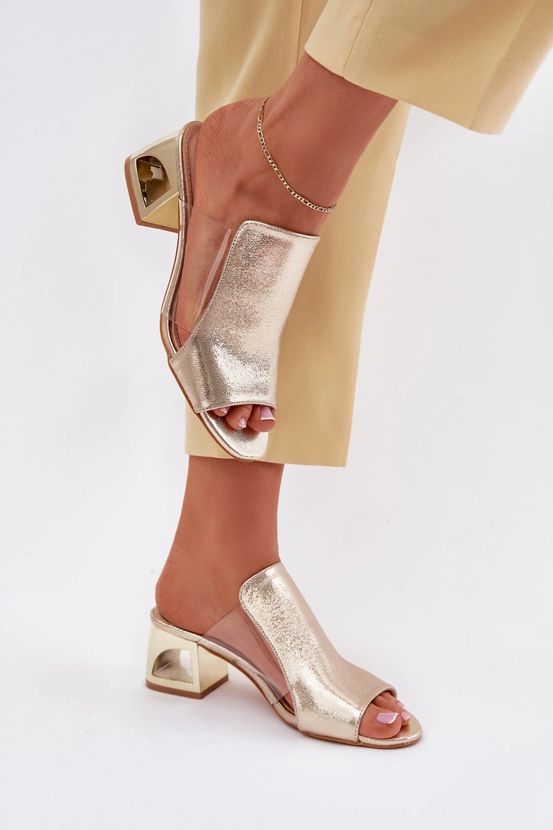 Klapki damskie z eko skóry, osadzone na złotym słupkowym obcasie, to elegancka propozycja na cieplejsze dni. Połączenie klasycznego materiału z nowoczesnym akcentem złotego obcasa sprawia, że idealnie pasują do sukienek oraz spodni materiałowych, dodając stylu i szyku każdej stylizacji. Komfort i modny wygląd w jednym! Przy wyborze rozmiaru prosimy kierować się tabelą rozmiarów.