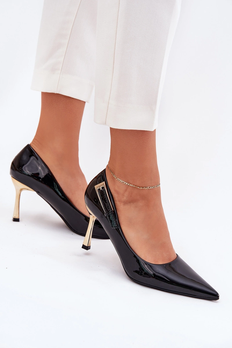 Szpilki damskie z eko skóry to połączenie stylu, elegancji i nowoczesnego wyglądu. Dzięki szpiczastym noskom buty optycznie wydłużają i wysmuklają nogi, dodając sylwetce smukłości i elegancji. Złoty obcas przyciąga wzrok, wprowadzając subtelną nutę luksusu, natomiast złota klamra stanowi elegancki detal, który podkreśla wyrafinowany charakter obuwia. Idealnie komponują się z wieczorowymi sukienkami, a także eleganckimi zestawami do pracy czy na wyjątkowe okazje. Przy wyborze rozmiaru prosimy sugerować się tabelą rozmiarów.