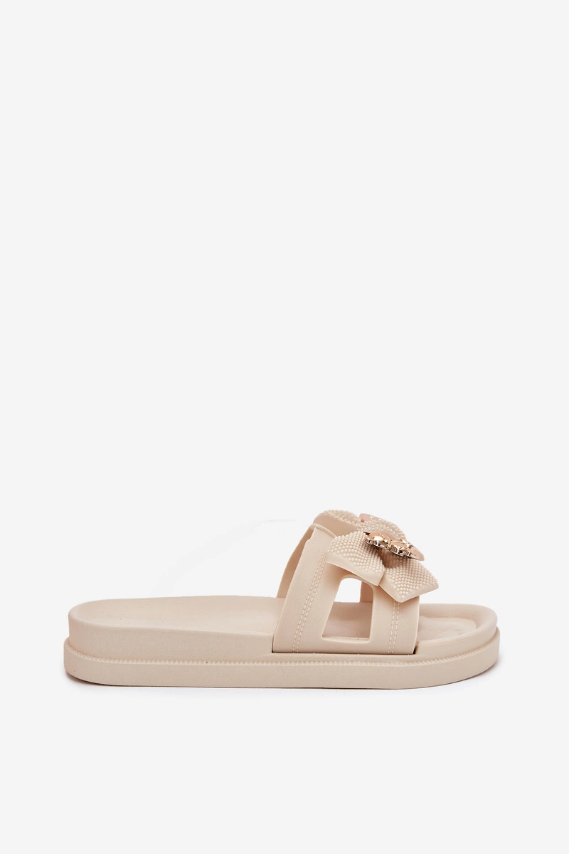 Klapki Damskie Z Kokardą I Złotą Broszką Jasnobeżowe Lynara