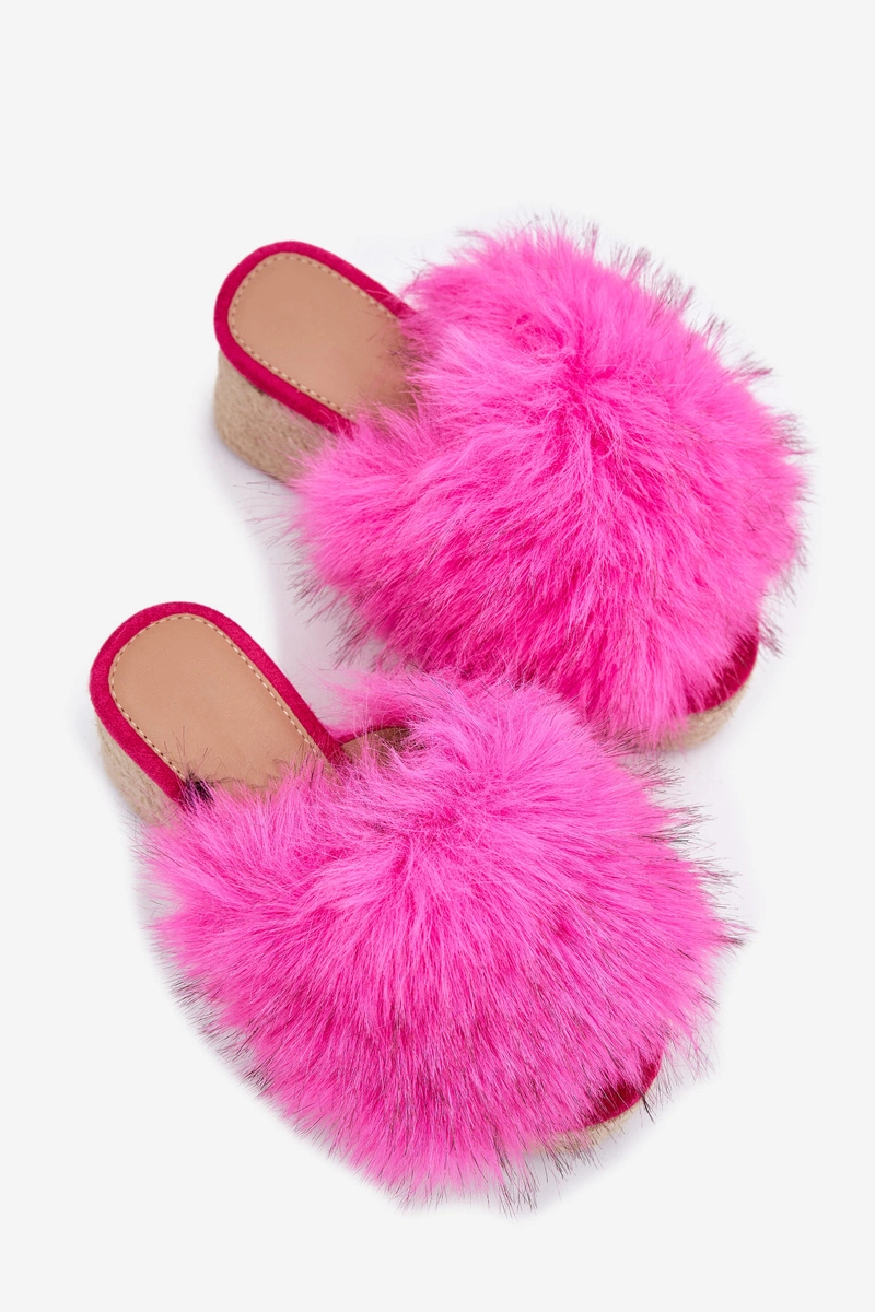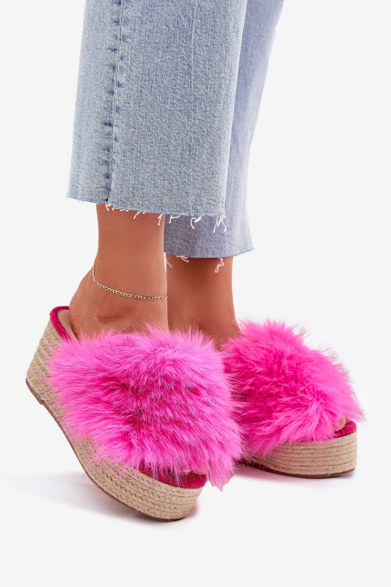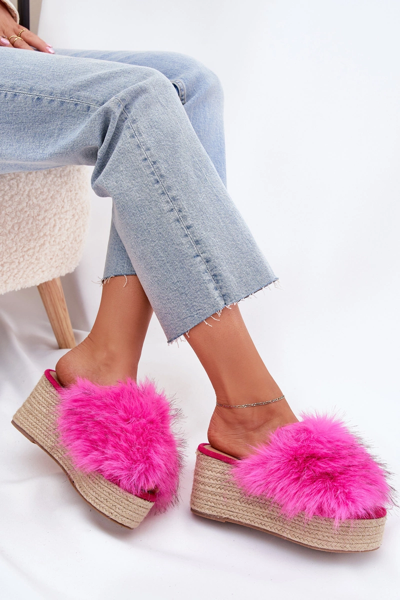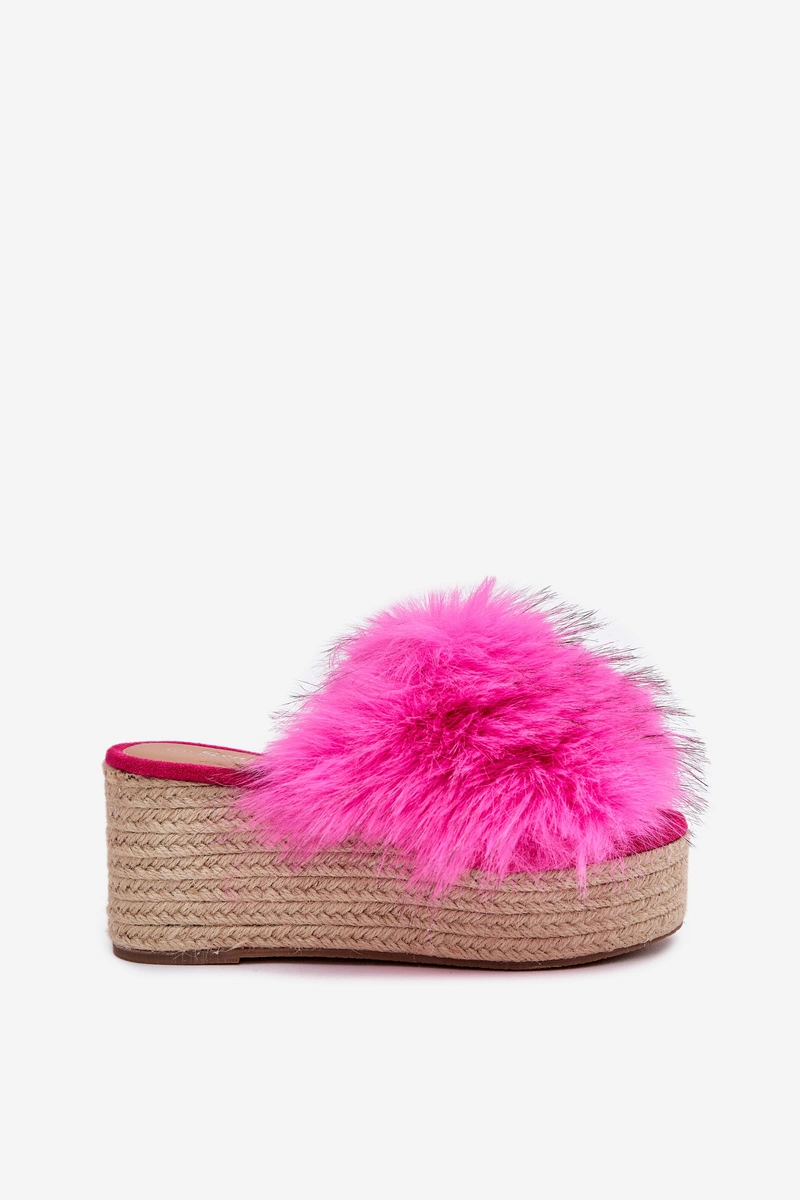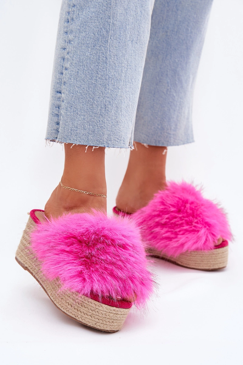 Klapki Damskie Na Koturnie Z Futerkiem I Plecionką Fuksja Virela