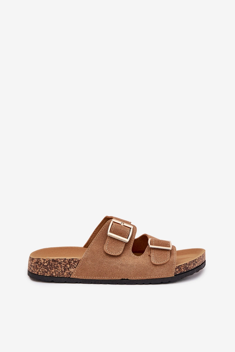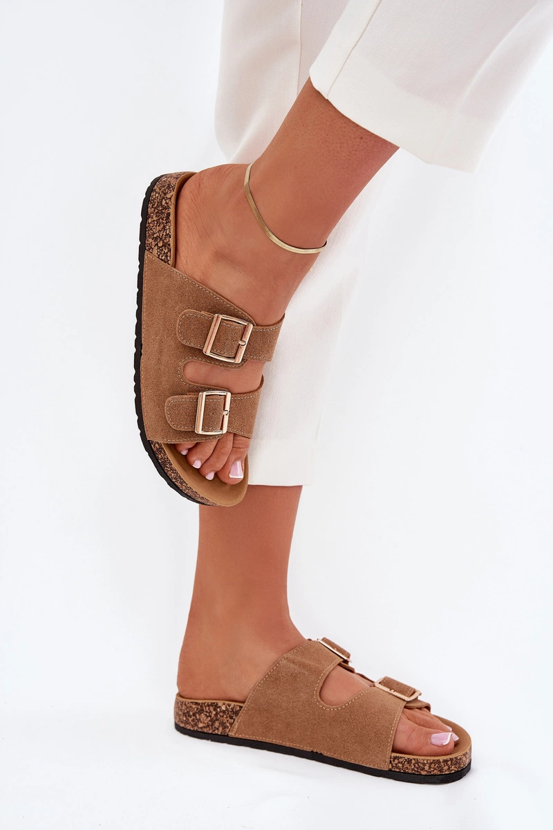 Klapki Damskie Ze Złotymi Klamrami I Przeszyciami Jasnobrązowe Lunera