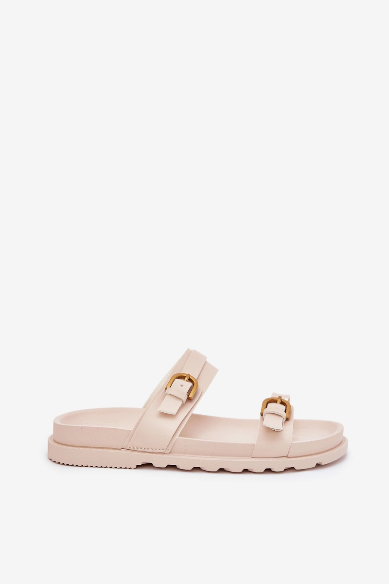 Klapki Damskie Z Paskami I Złotymi Klamrami Jasnobeżowe Selana