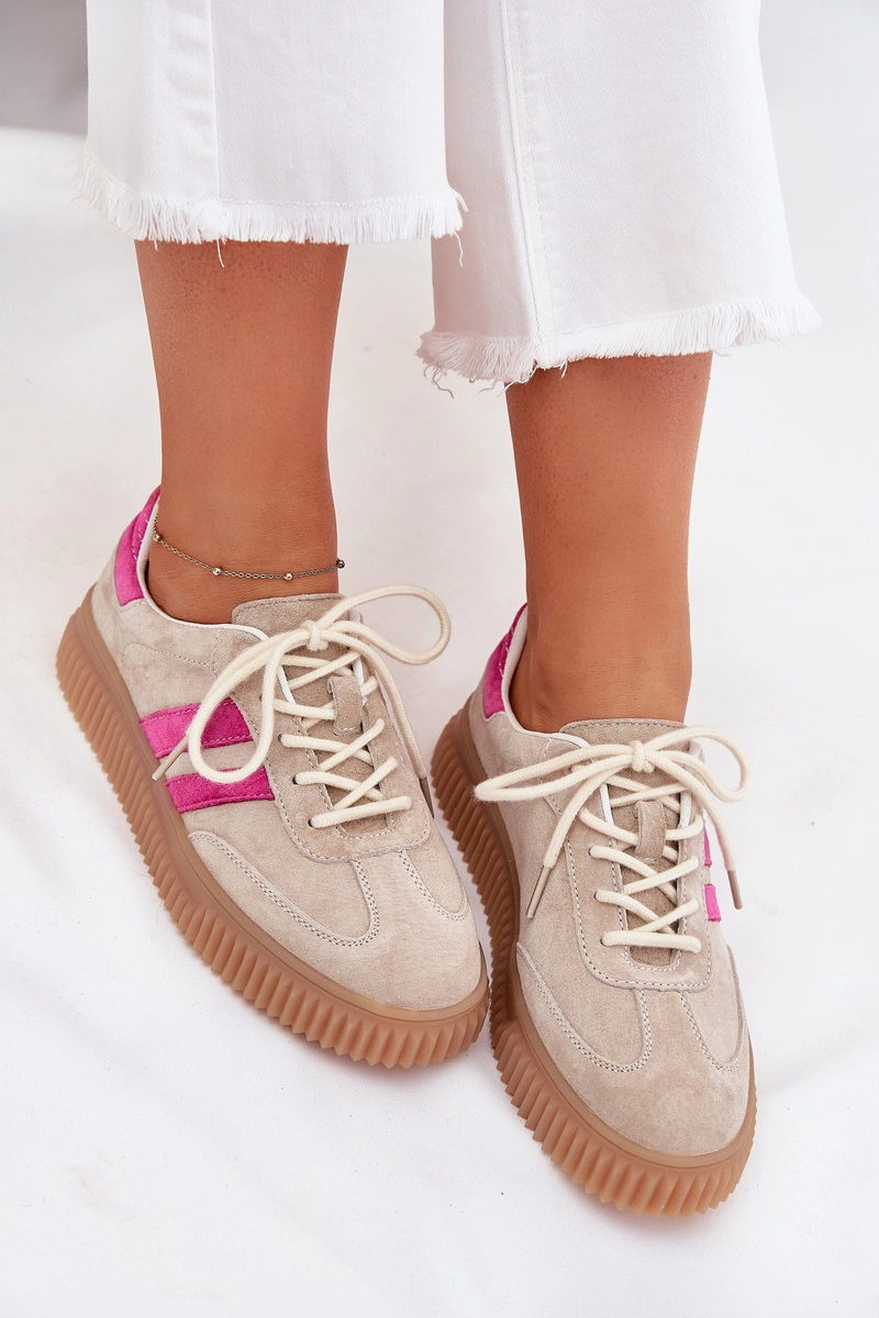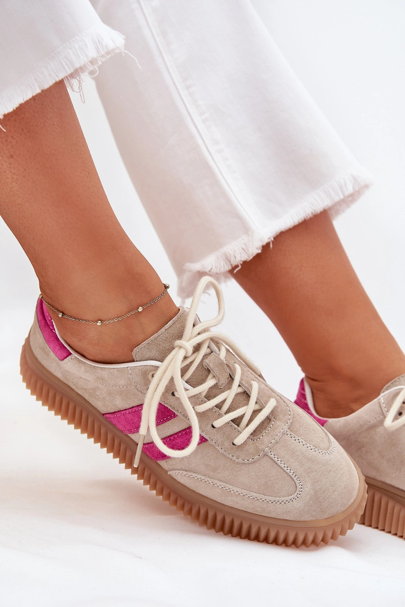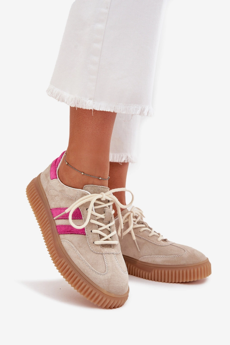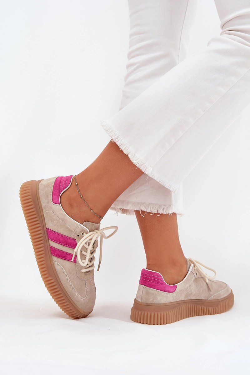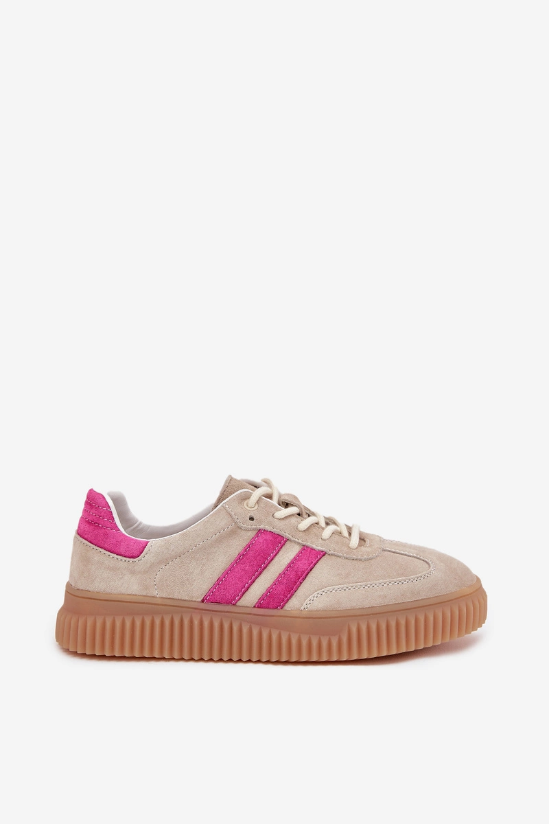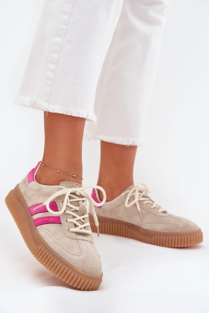 Damskie sneakersy wykonane z naturalnego zamszu i osadzone na platformie łączą wygodę z modnym stylem. Zaokrąglone noski i skórzana wkładka gwarantują całodzienny komfort. Świetnie sprawdzą się na co dzień, idealnie pasując do dżinsów, sukienek czy spódnic. Przy wyborze rozmiaru prosimy kierować się tabelą rozmiarów.