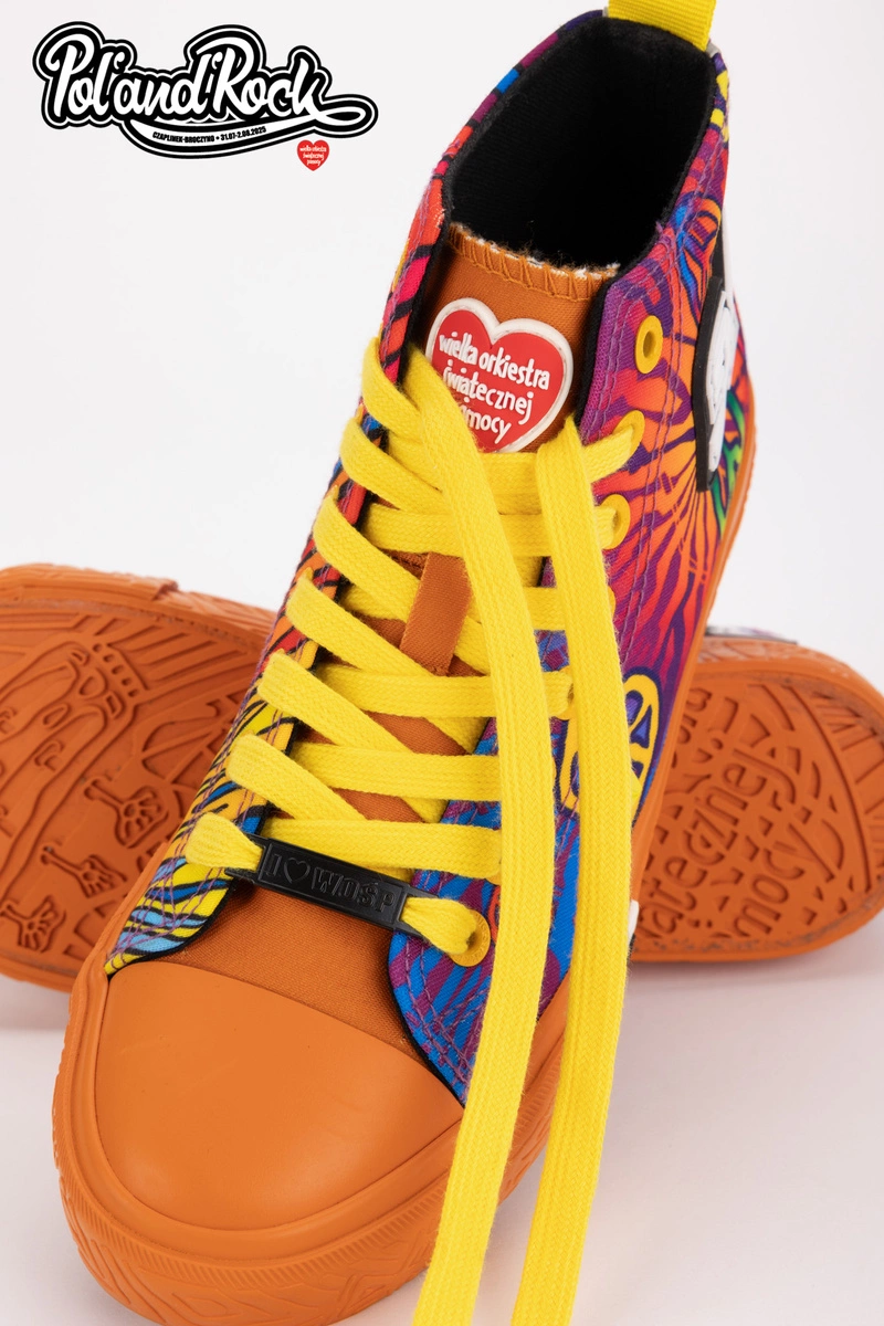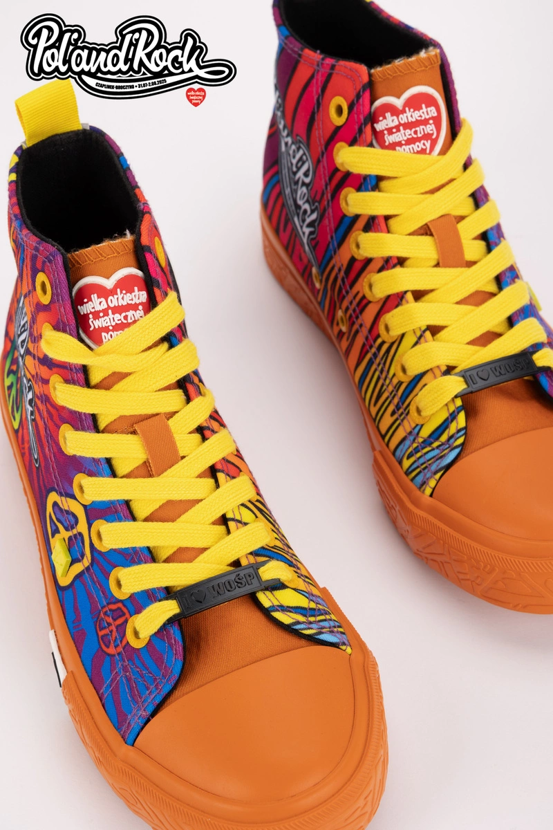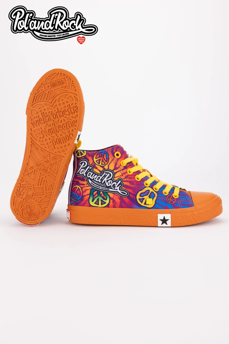 To najbardziej kolorowy i wyrazisty model z całej kolekcji, który został zaprojektowany przez zespół grafików Jurka Owsiaka. Trampki zachwycają żywą, intensywną kolorystyką odzwierciedlając energię i radość płynącą z muzyki i wspólnego świętowania. Niebieski kolor tworzy tło dla dynamicznych, wielobarwnych grafik. Na butach widnieje duży, biały napis Pol'and'Rock jednoznacznie wskazując na muzyczny charakter modelu. Żółte sznurowadła dodają wyrazistego kontrastu, a białe logo Big Star Shoes na boku podkreślają dbałość o detale.