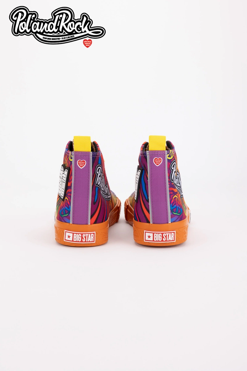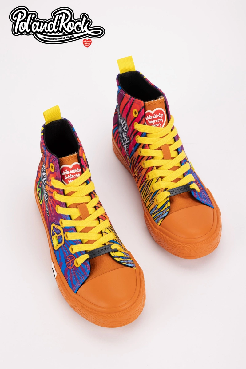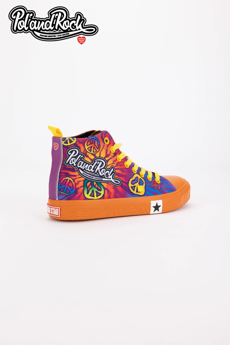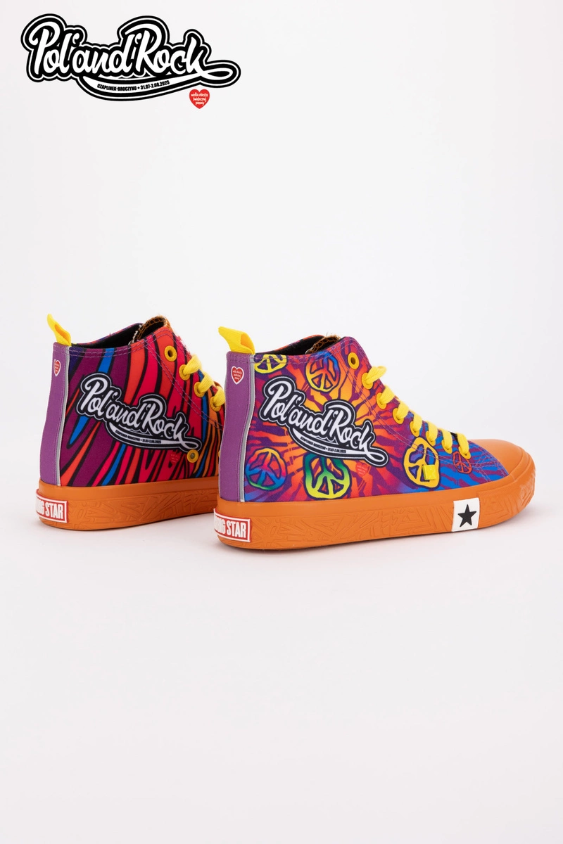 To najbardziej kolorowy i wyrazisty model z całej kolekcji, który został zaprojektowany przez zespół grafików Jurka Owsiaka. Trampki zachwycają żywą, intensywną kolorystyką odzwierciedlając energię i radość płynącą z muzyki i wspólnego świętowania. Niebieski kolor tworzy tło dla dynamicznych, wielobarwnych grafik. Na butach widnieje duży, biały napis Pol'and'Rock jednoznacznie wskazując na muzyczny charakter modelu. Żółte sznurowadła dodają wyrazistego kontrastu, a białe logo Big Star Shoes na boku podkreślają dbałość o detale.