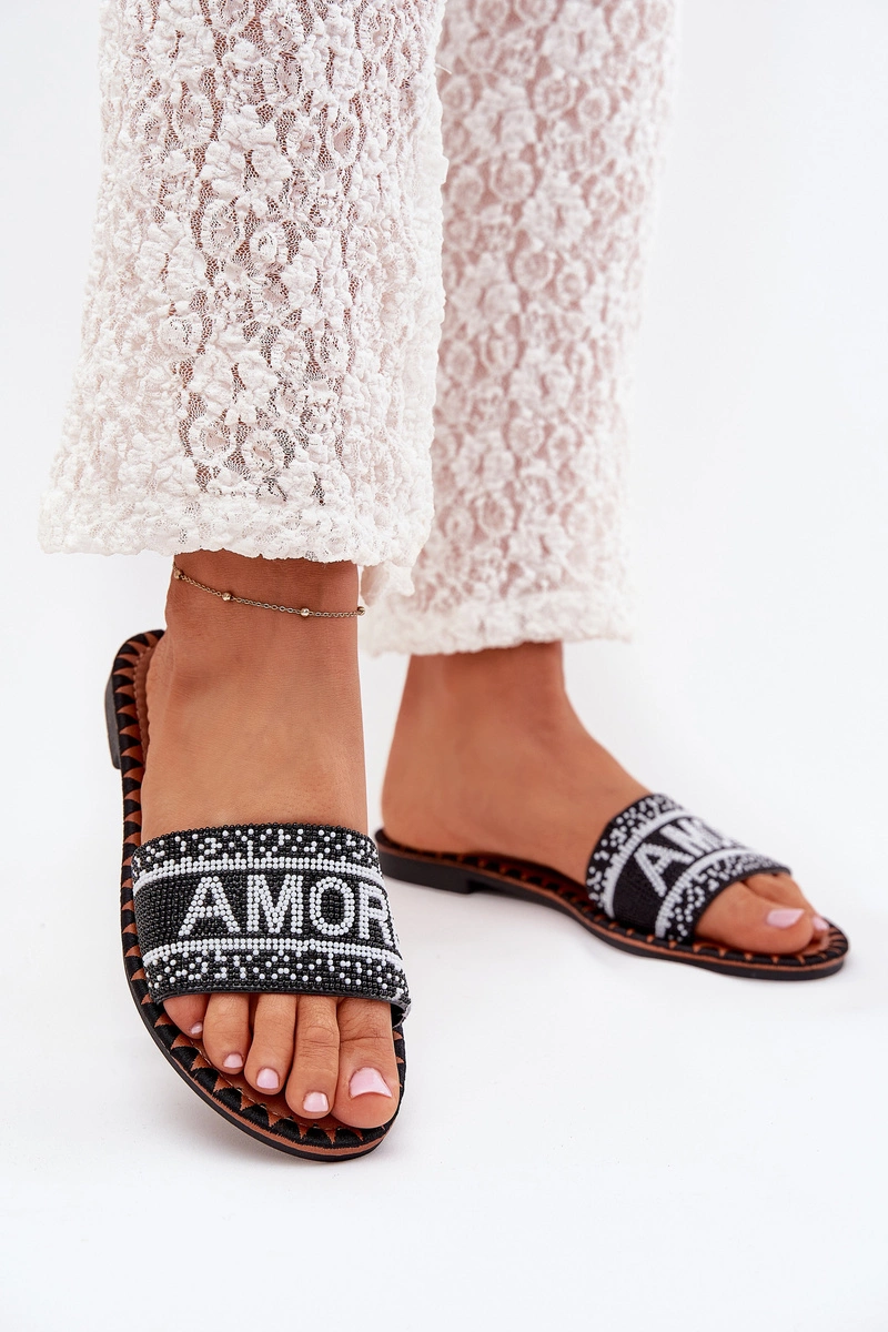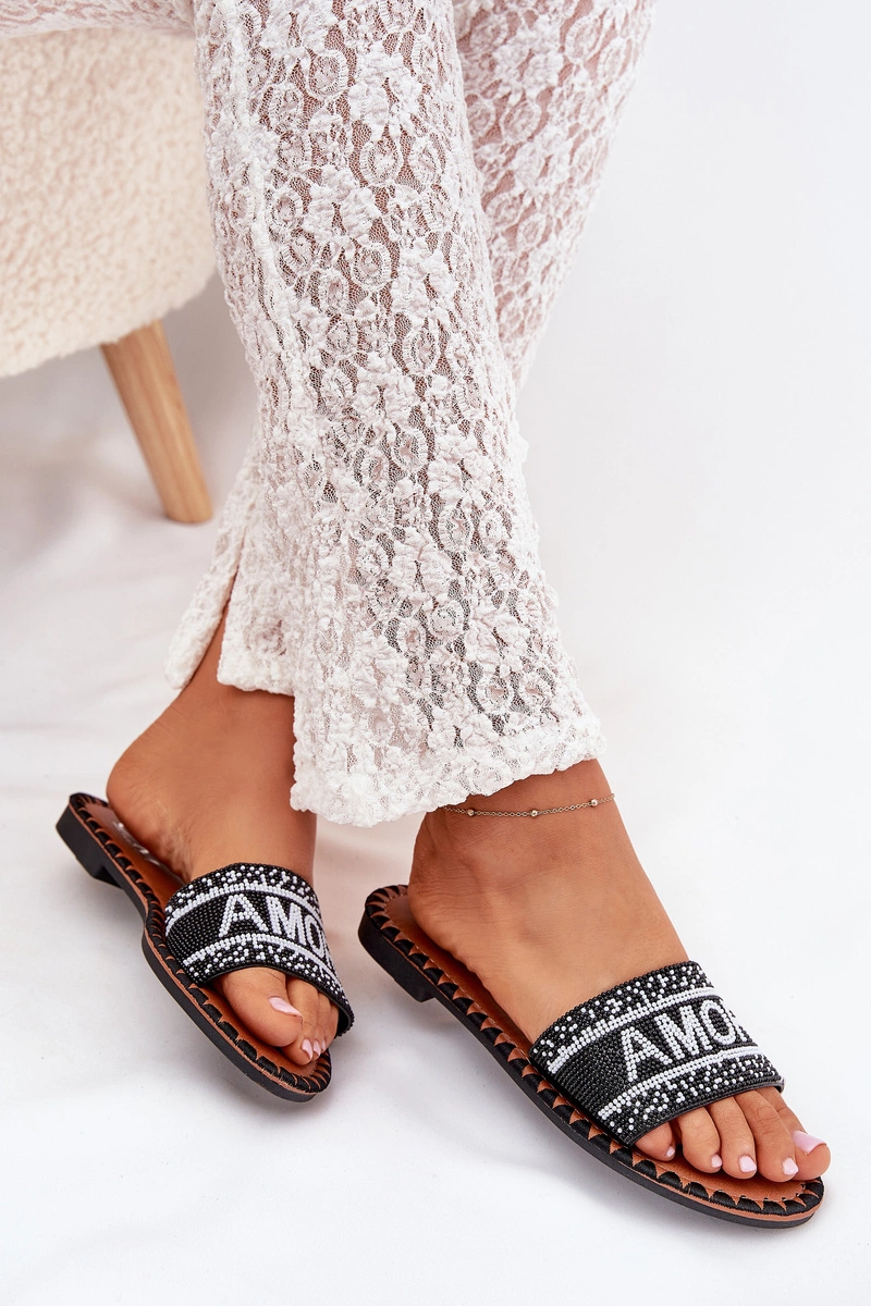 Klapki Damskie Na Płaskim Obcasie Ze Zdobieniem Amore Czarne Avelina