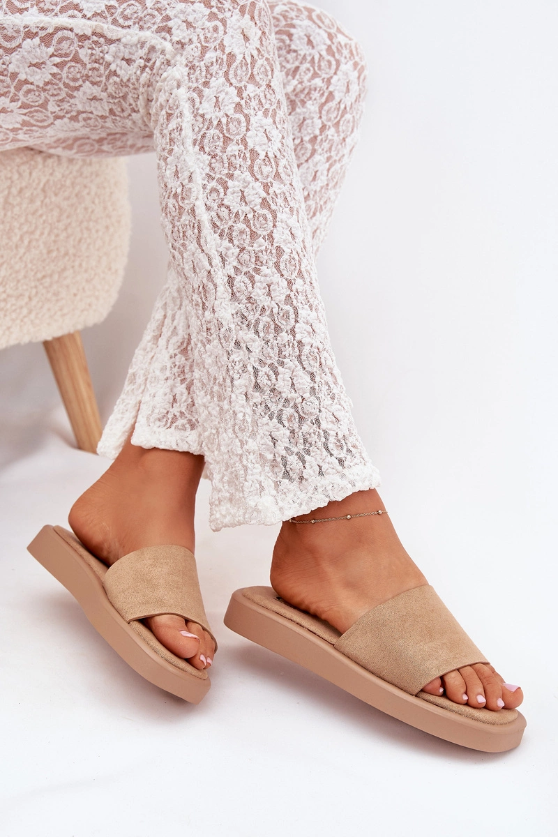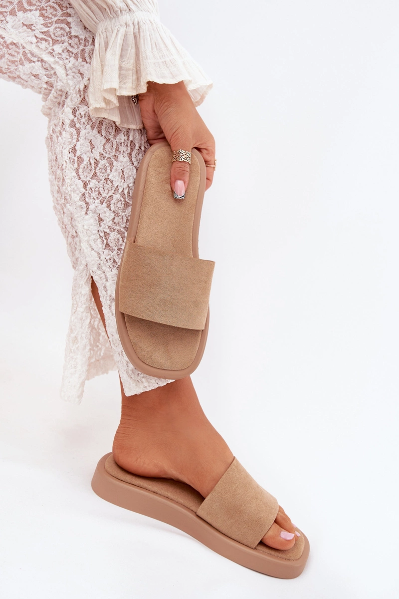 Klasyczne klapki damskie z eko zamszu, osadzone na platformie, łączą wygodę z prostym stylem. Idealne do casualowych stylizacji, doskonale komponują się z sukienkami, spódnicami czy spodniami, zapewniając komfort i elegancki wygląd na co dzień. Przy wyborze rozmiaru prosimy sugerować się tabelą rozmiarów.