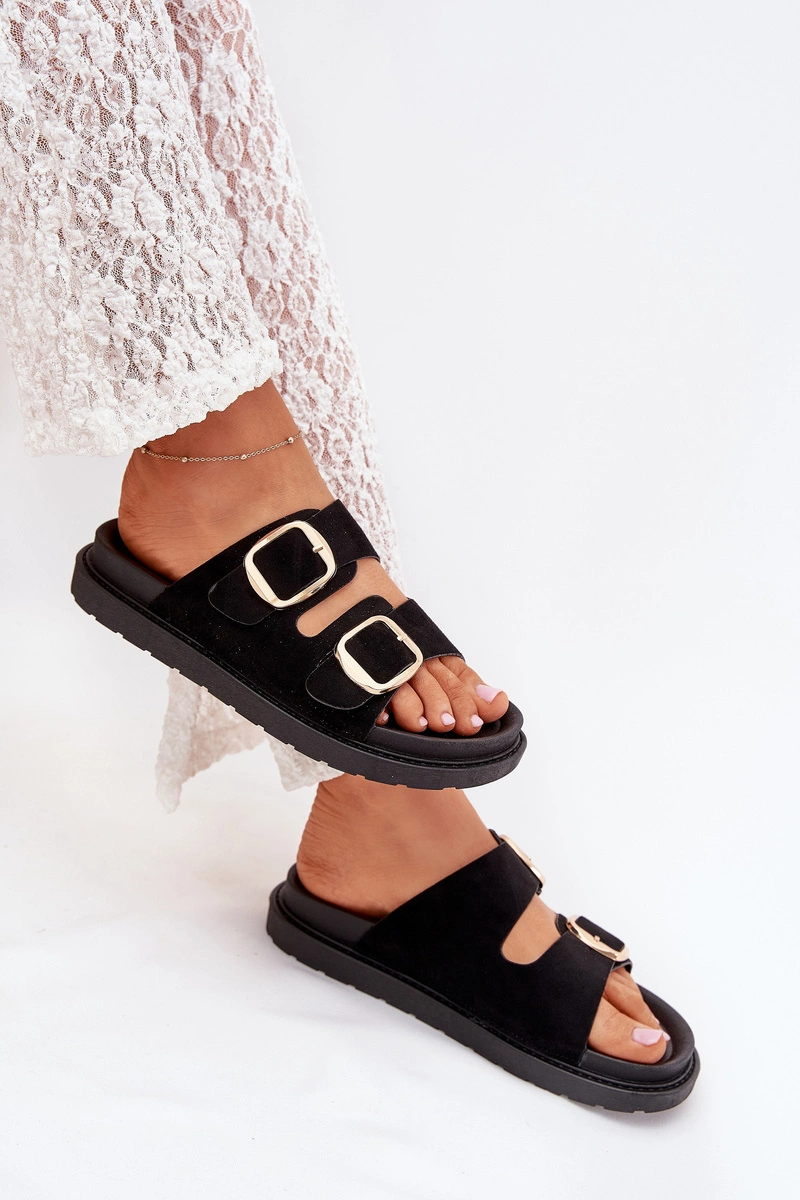 Klapki damskie wykonane z eko zamszu. Osadzone na platformie. Dwa regulowane paski ze złotymi klamrami zapewniają idealne dopasowanie, a profilowana wkładka gwarantuje komfort przez cały dzień. Idealne na codzienne wyjścia. Przy wyborze rozmiaru rosimy sugerować się tabelą rozmiarów.
