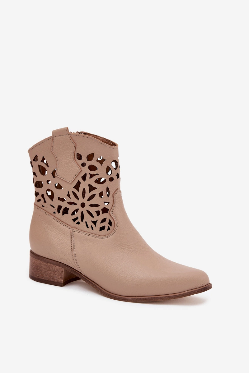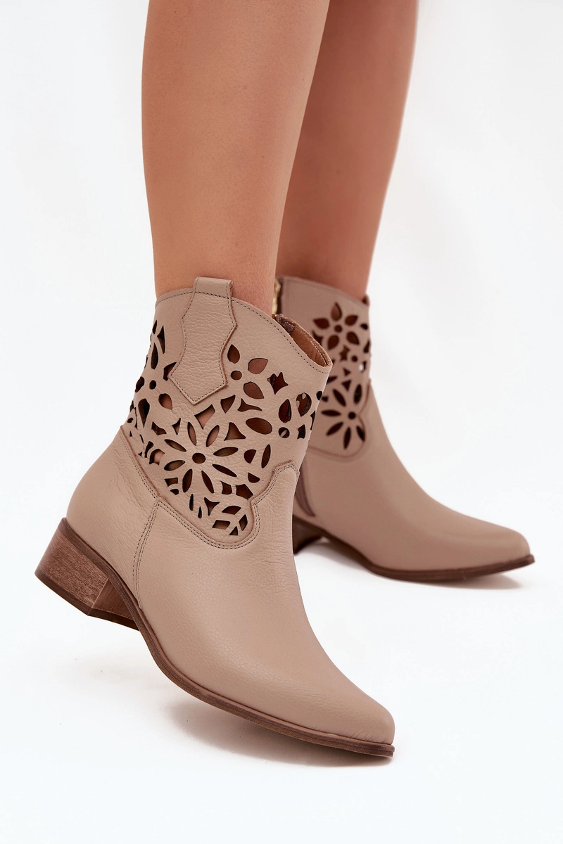 Zazoo 3404 Ażurowe Botki Kowbojki Na Niskim Obcasie Skórzane Ciemnobeżowe
