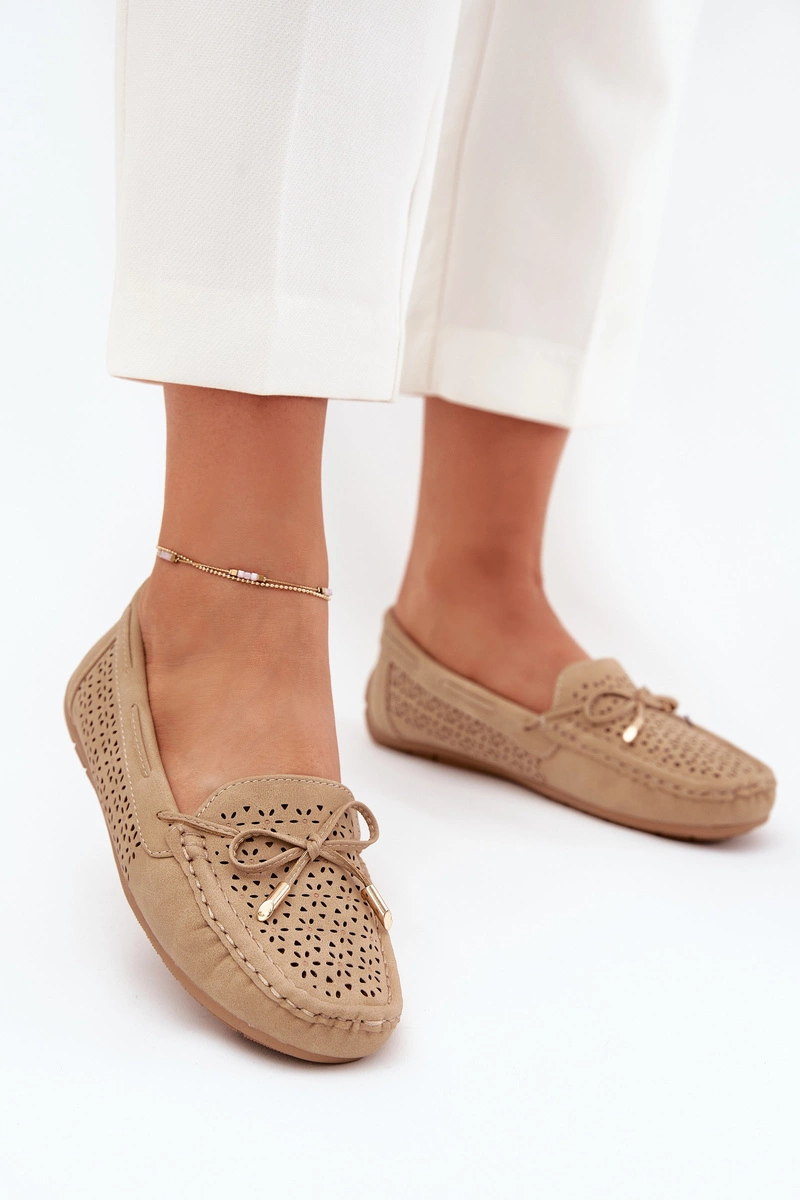 Mokasyny damskie wykonane z eko skóry, ozdobione ażurowym wzorkiem, to doskonała propozycja na wiosnę i lato. Z przodu znajdują się wiązanie w formie kokardki, które dodaje subtelności i uroku. Miękka wkładka zapewnia komfort przez cały dzień, a zaokrąglone noski gwarantują wygodę. Doskonałe do casualowych stylizacji, świetnie komponują się z sukienkami, spódnicami i spodniami, wprowadzając do każdej kreacji lekkość i elegancję. Przy wyborze rozmiaru prosimy sugerować się tabelą rozmiarów.