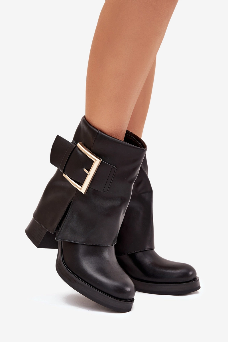 Botki Damskie Ocieplane Na Słupku Ze Złotą Klamrą Czarne Milira