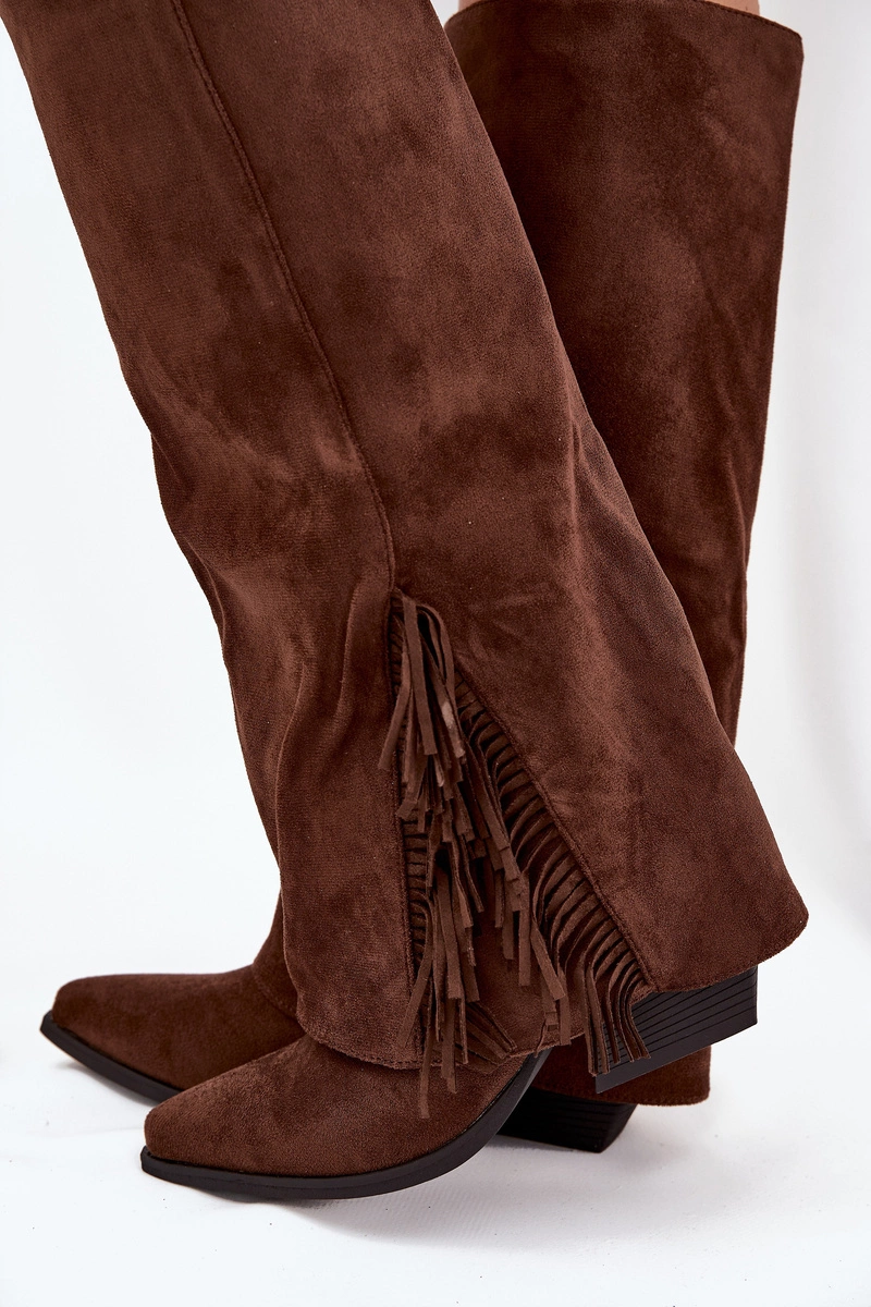 Wsuwane Kozaki Kowbojki Damskie Na Słupku Z Frędzlami Brązowe Zalia