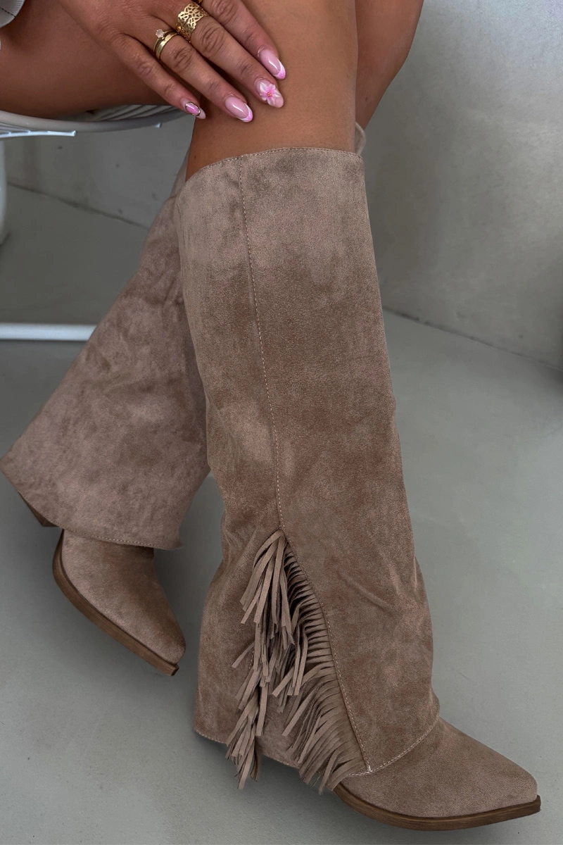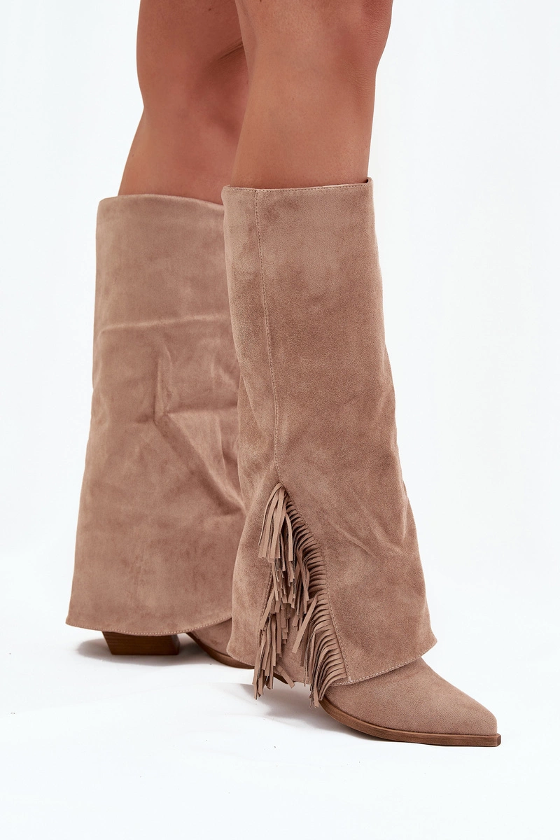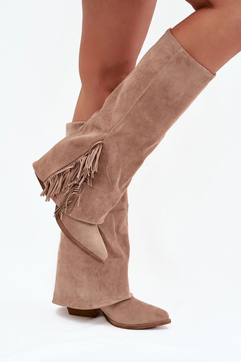 Wsuwane Kozaki Kowbojki Damskie Na Słupku Z Frędzlami Beżowe Zalia