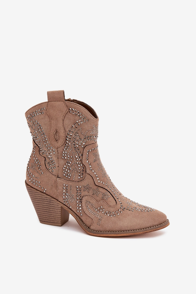 Ocieplane Damskie Botki Kowbojki Ze Zdobieniem Beżowe Lelira