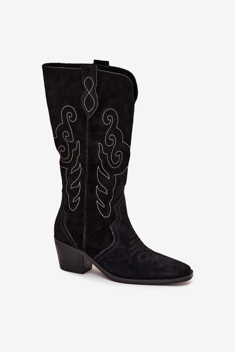 Zamszowe Kozaki Kowbojki Damskie Na Obcasie Czarne Karira