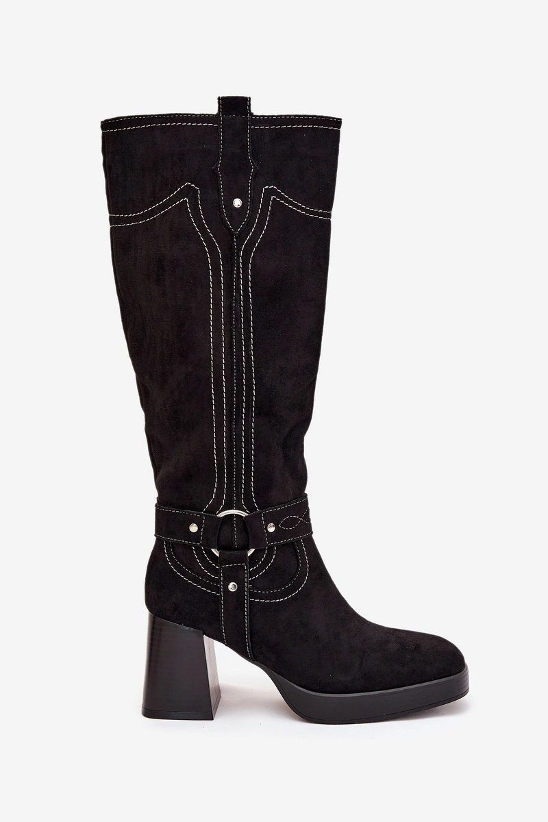 Kozaki damskie wykonane z eko zamszu. Osadzone na słupkowym obcasie. Zapinane na zamek, zapewniają łatwość zakładania, a ocieplenie kocem obuwniczym gwarantuje ciepło w chłodniejsze dni. Cholewka sięgająca do kolana ozdobiona jest subtelnym elementem z paskami oraz przeszyciami, które dodają butom charakteru. Te kozaki będą doskonałym wyborem do eleganckich i casualowych stylizacji, zapewniając komfort i modny wygląd. Przy wyborze rozmiaru prosimy sugerować się tabelą rozmiarów.