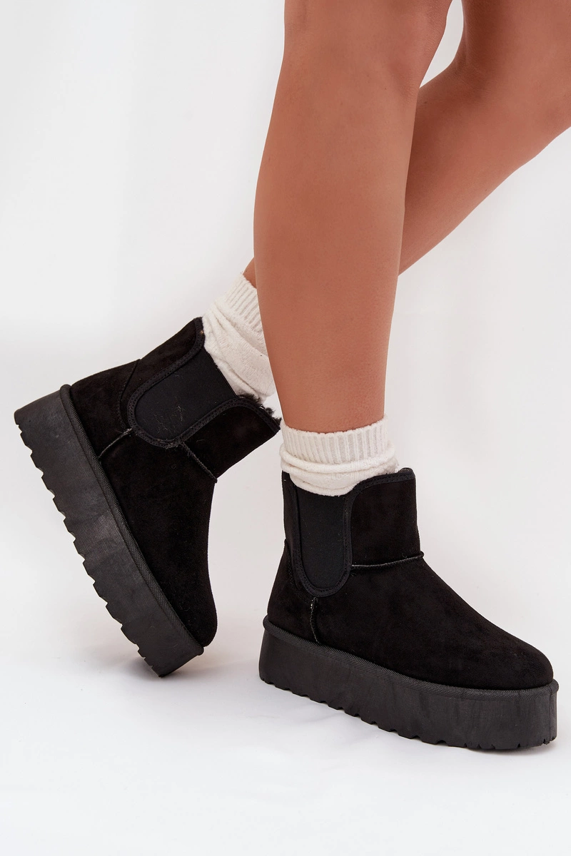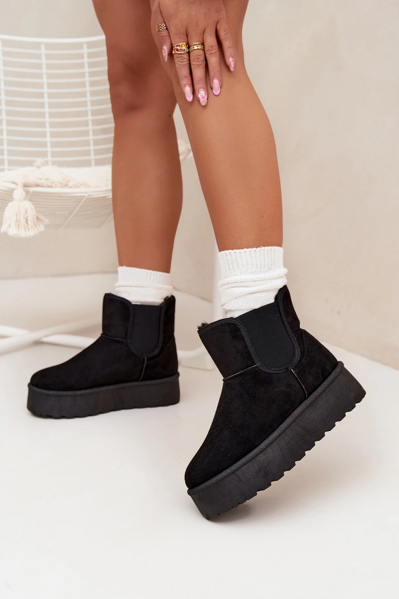 Modne śniegowce damskie osadzone na platformie, która skutecznie izoluje od zimnego podłoża, to doskonały wybór na zimowe dni. Wykonane z eko zamszu, zapewniają elegancki wygląd, a elastyczne wstawki w cholewce gwarantują wygodę i dopasowanie. Ocieplenie grubym futerkiem zapewnia ciepło nawet w najchłodniejsze dni. Ten stylowy fason doskonale komponuje się z różnymi zimowymi stylizacjami. Przy wyborze rozmiaru prosimy sugerować się tabelą rozmiarów.