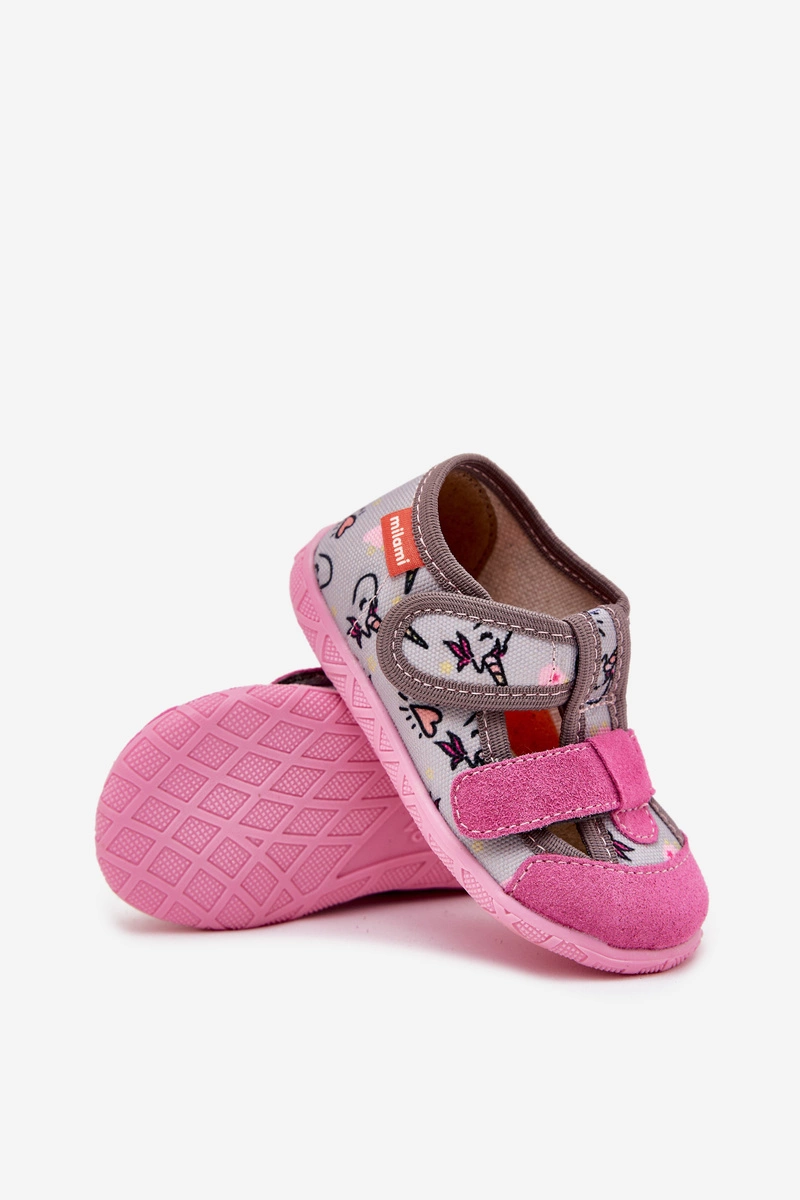 Kapcie Milami Dziecięce Na Rzepy W Jednorożce Szaro-Różowe Reathiana