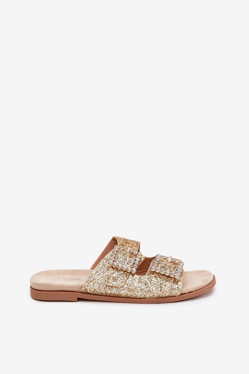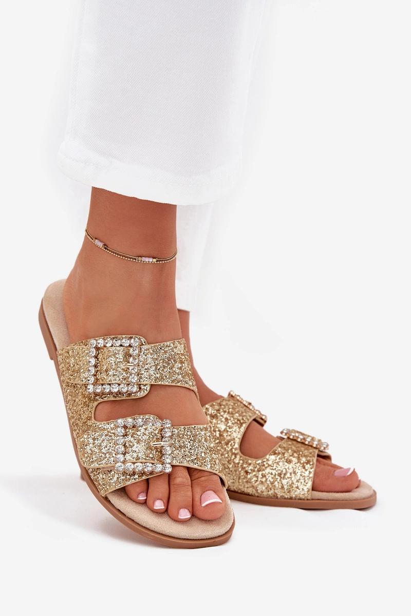 Błyszczące Zdobione Klapki Z Klamrami Na Płaskim Obcasie Złote Tovira