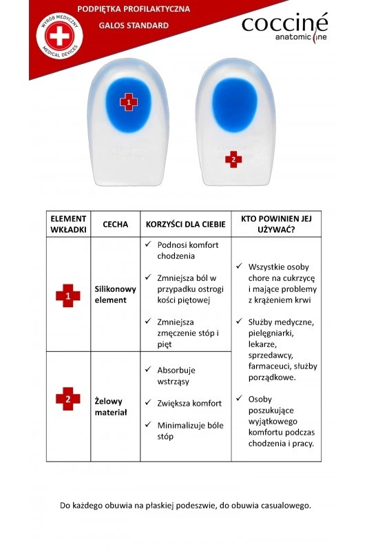 GALOS STANDARD - podpiętki żelowe absorbują wstrząsy, przynoszą ulgę stopom zmęczonym oraz osobom z bólami stawów i pięt. Odpowiednie dla stóp osób chorych na cukrzycę i mających problemy z krążeniem krwi. Silikonowy element pod piętą podnosi komfort chodzenia oraz niweluje ból w przypadku ostrogi kości piętowej.