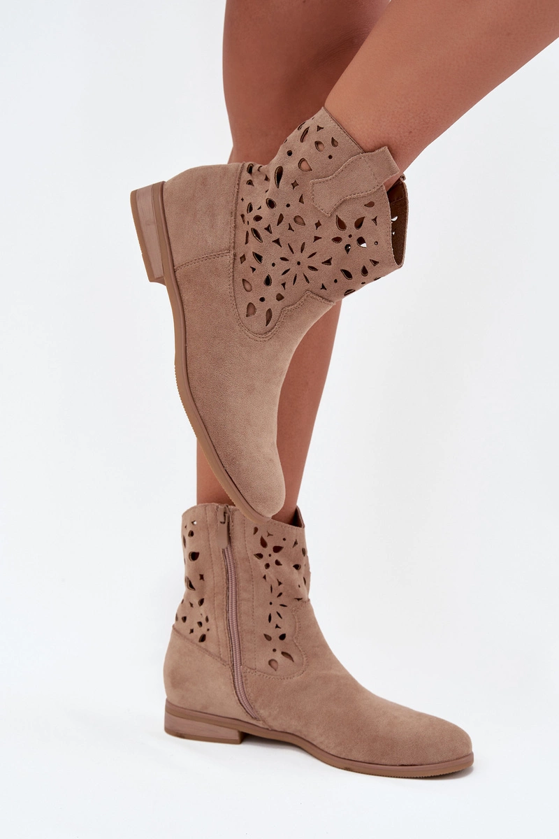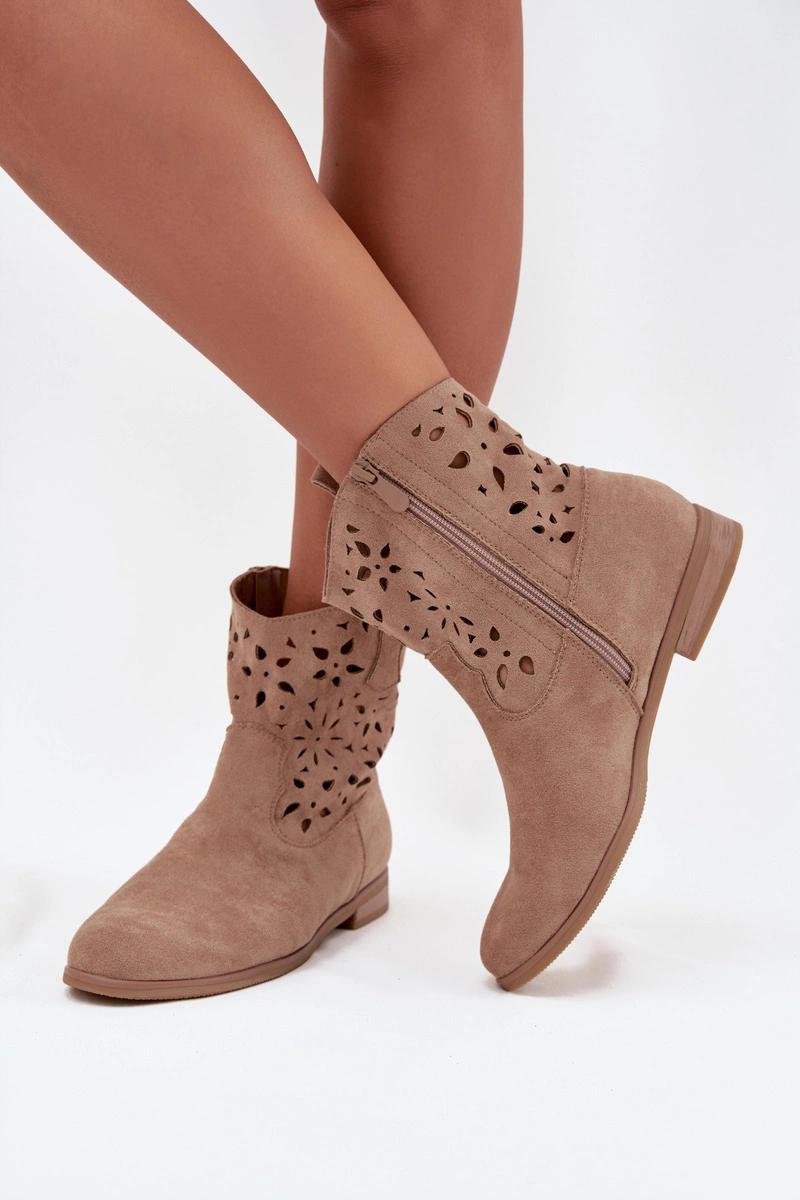 Botki Damskie Z Ażurowym Wzorem Na Płaskim Obcasie Eko Zamszowe Beżowe Athera