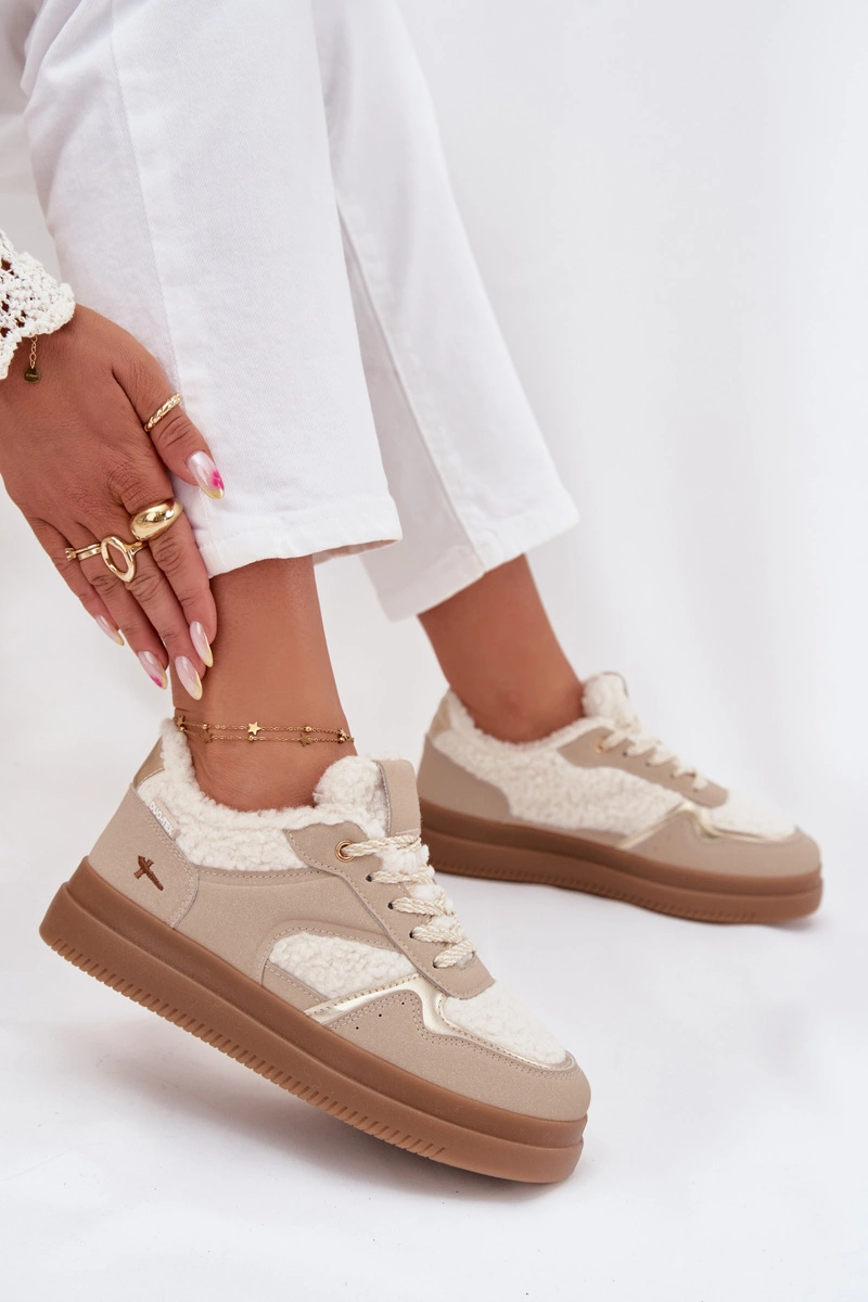 Sneakersy Damskie Na Platformie Z Futerkiem Typu Baranek Beżowe Frelina