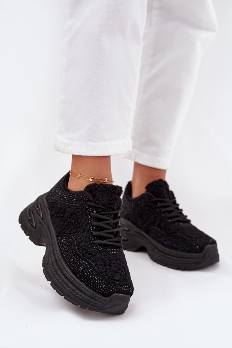 Stylowe sneakersy damskie na masywnej platformie to doskonały wybór na chłodniejsze dni, łączący modny wygląd z wygodą. Wyróżniają się futerkiem typu baranek oraz cyrkoniami, które nadają im wyjątkowego charakteru. Sznurowane, zapewniają idealne dopasowanie do stopy, a środek ocieplany kocem obuwniczym gwarantuje ciepło przez cały dzień. Przy wyborze rozmiaru prosimy kierować się tabelą rozmiarów.