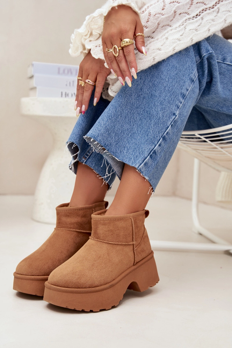Śniegowce Damskie Niskie Wsuwane Ocieplane Futerkiem Camel Mavelle
