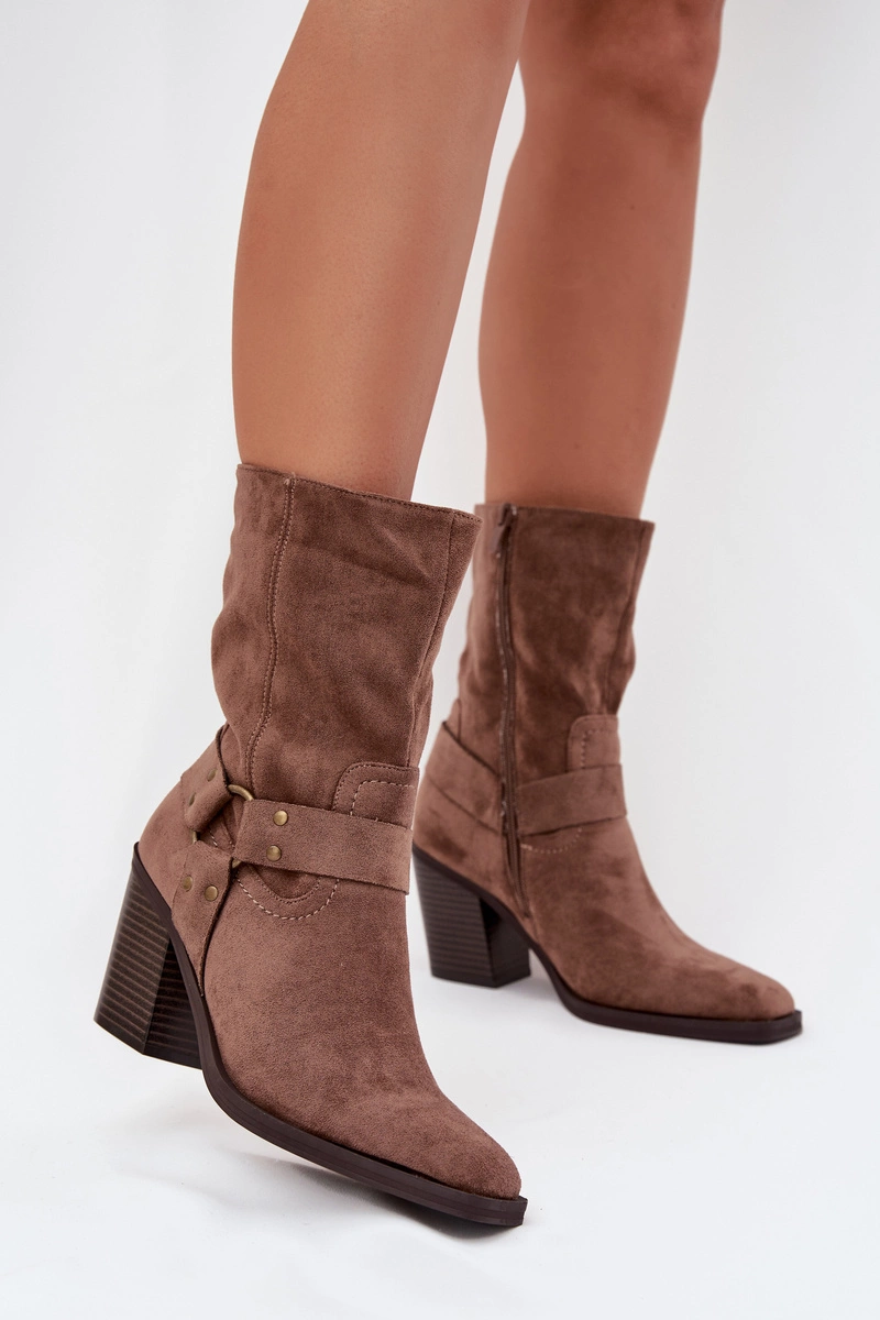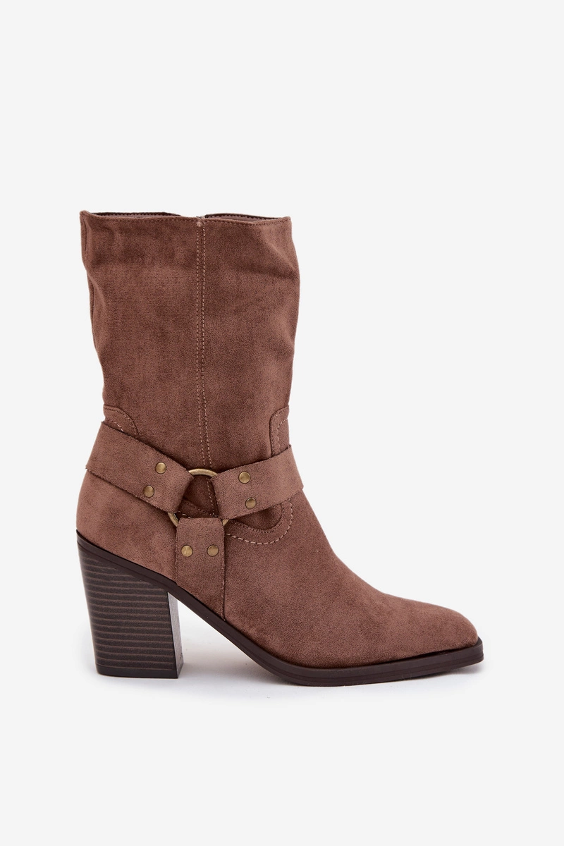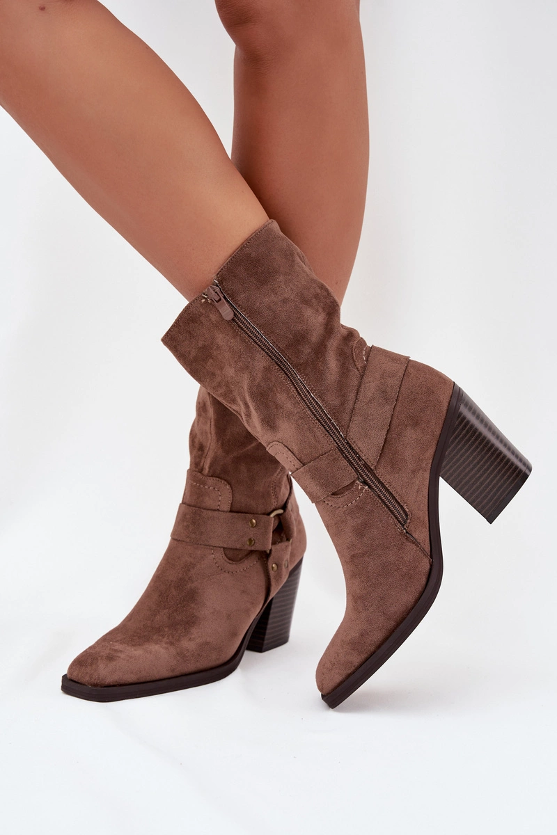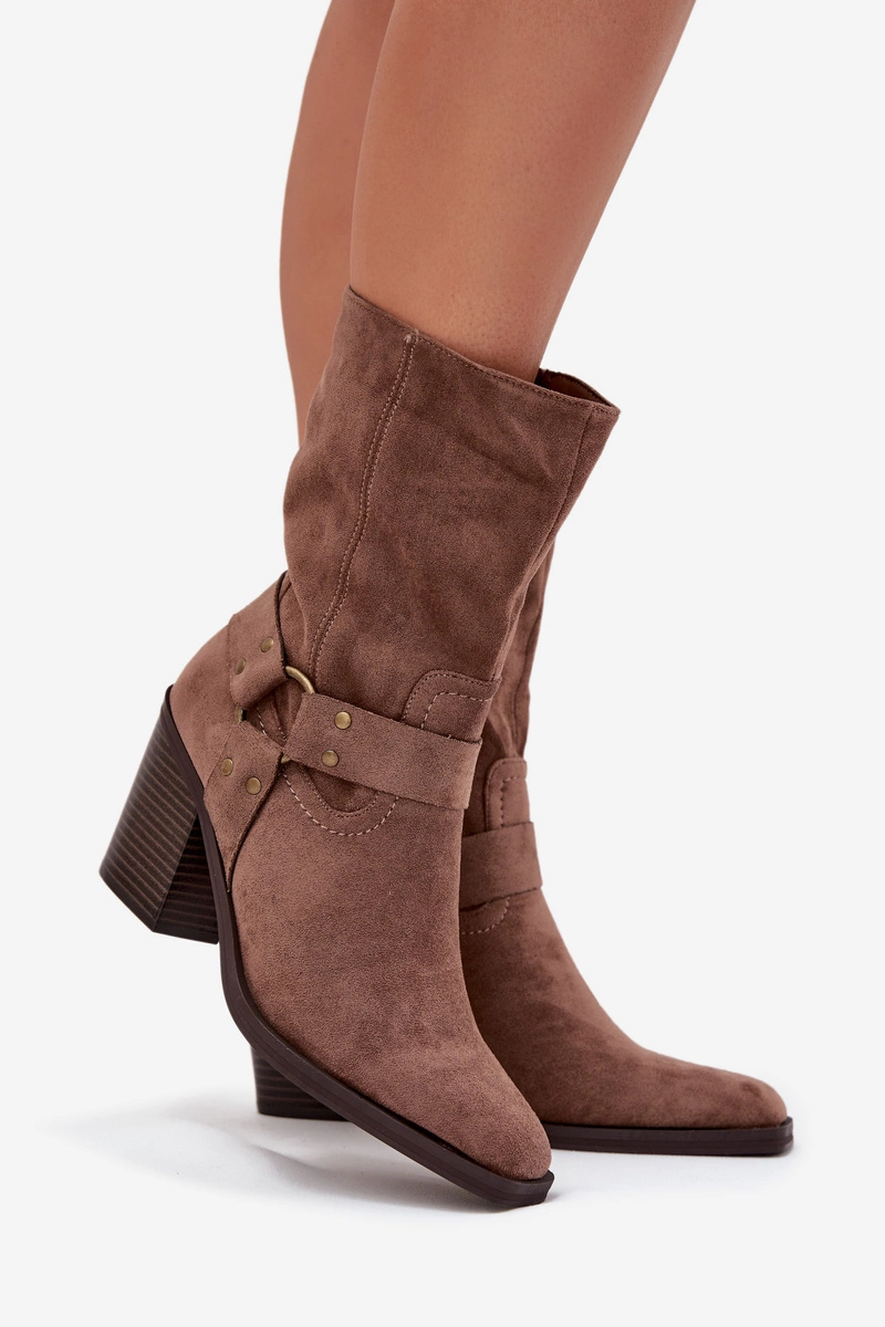 Botki Damskie Ocieplane Na Słupku Z Paskami I Ozdobnym Detalem Brązowe Neria