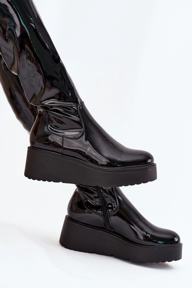 Lakierowane Kozaki Za Kolano Na Platformie I Delikatnym Koturnie Czarne Tavina