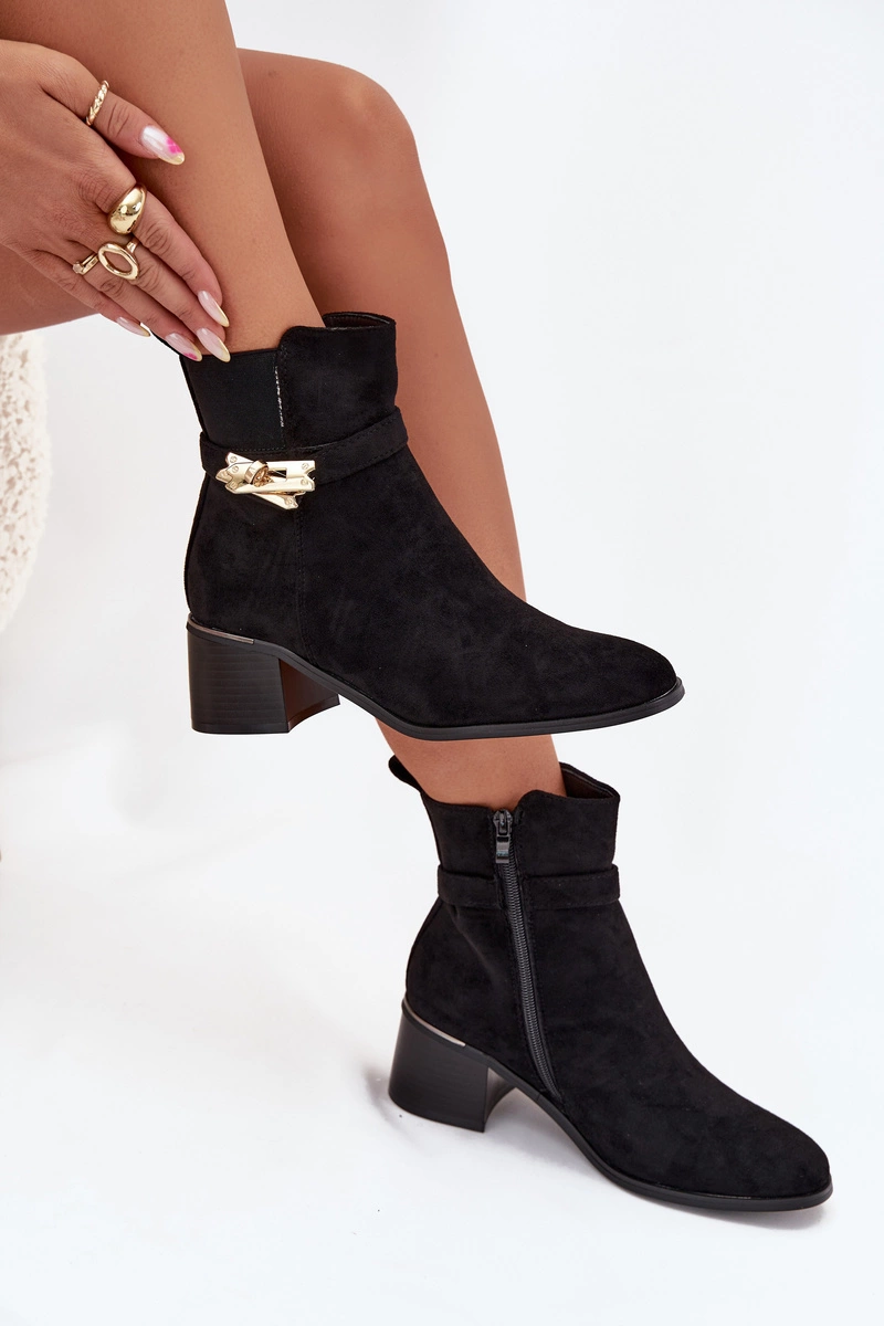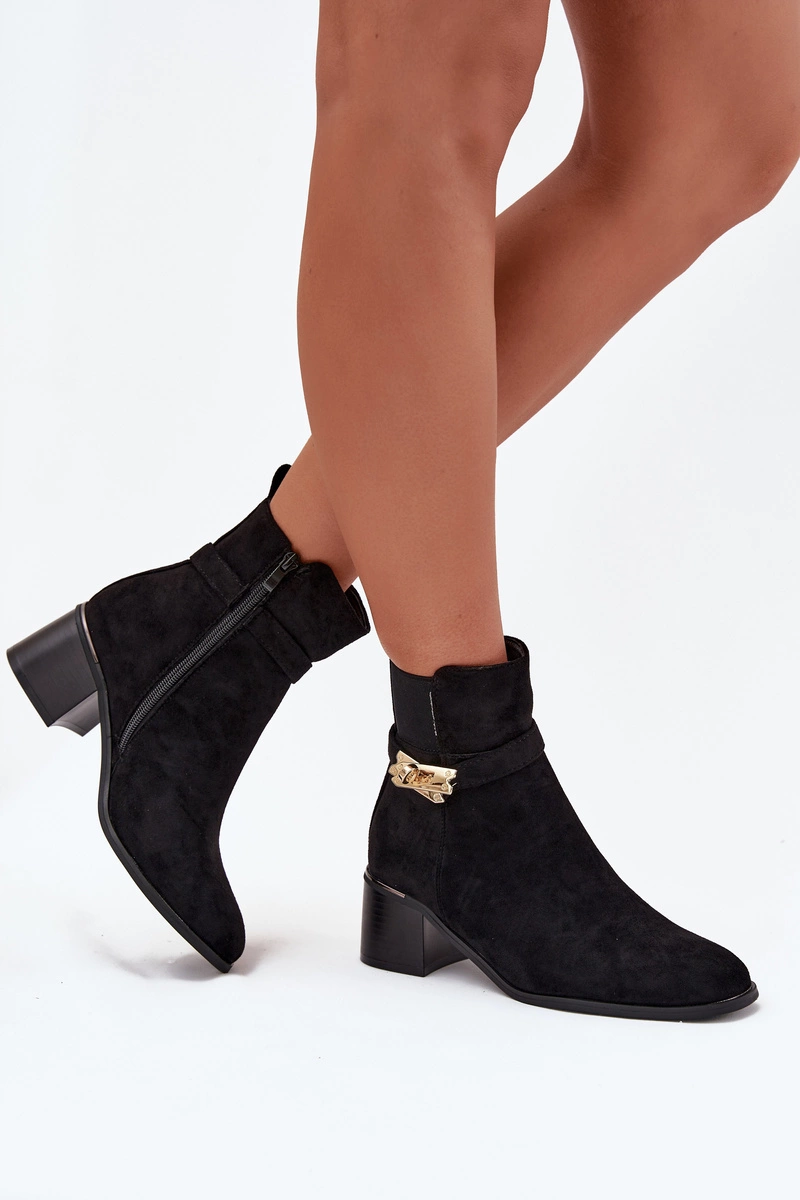Ocieplane Botki Damskie Ze Złotą Ozdobą Na Klocku Czarne Sarona