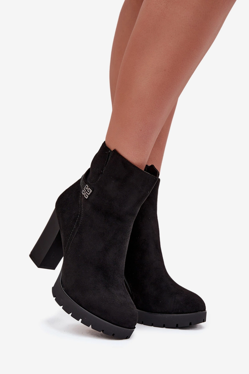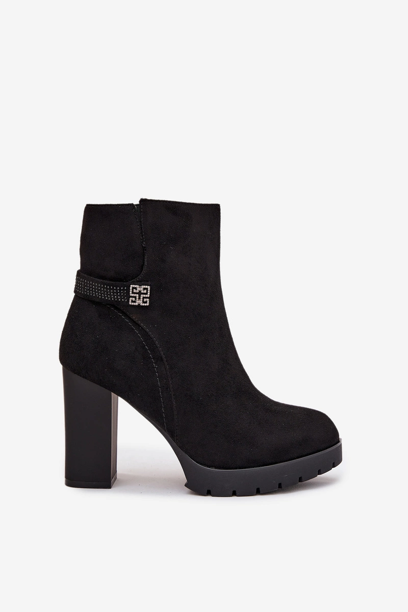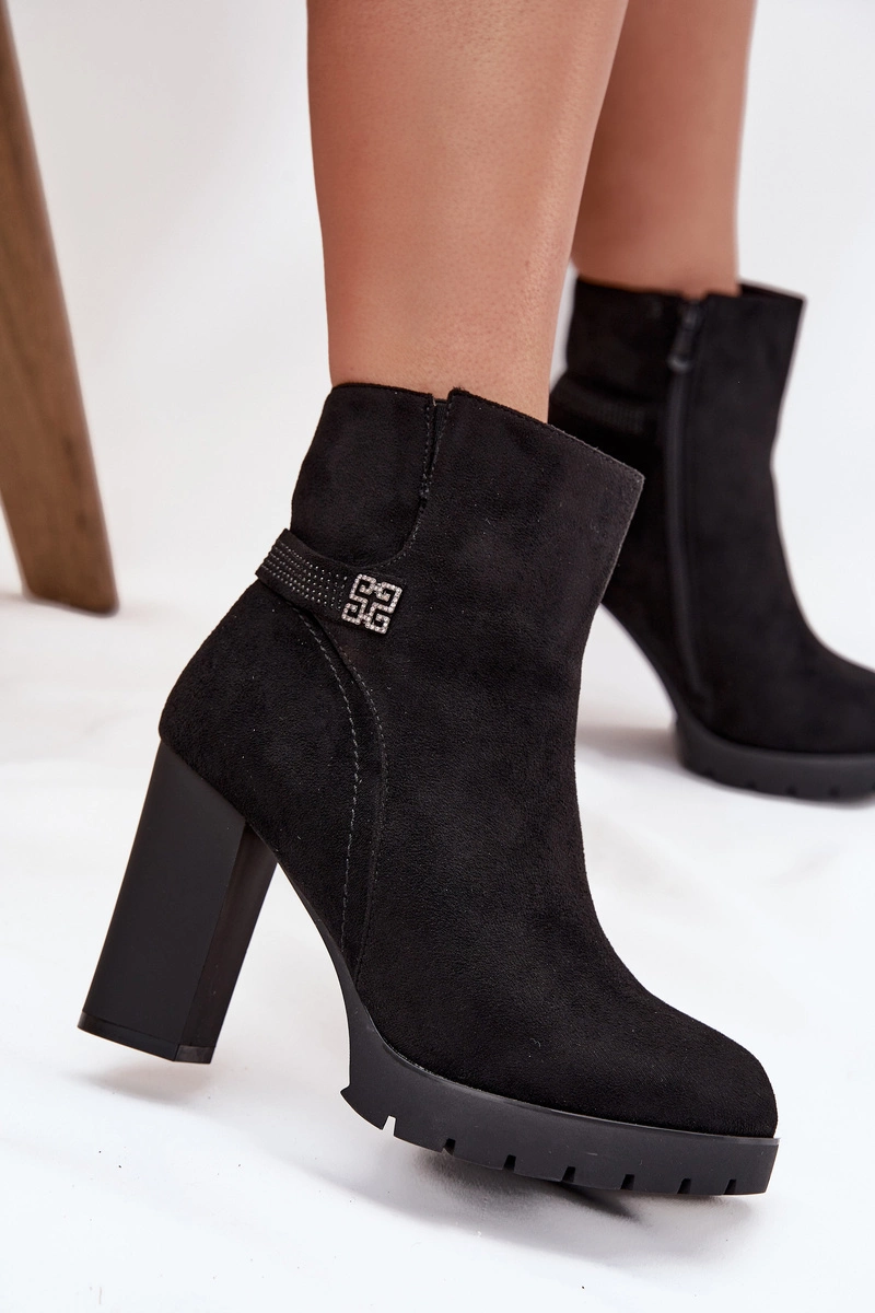 Ocieplane Botki Damskie Na Słupku Z Ozdobnym Paskiem Czarne Zayna