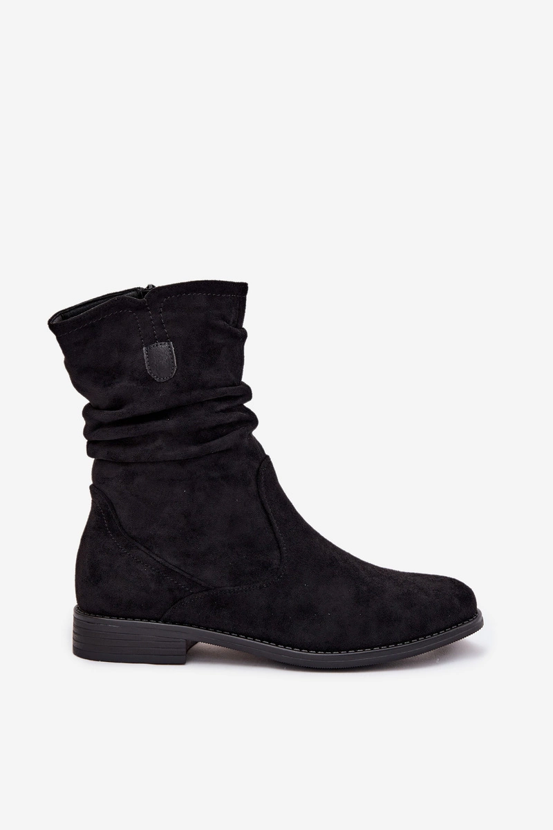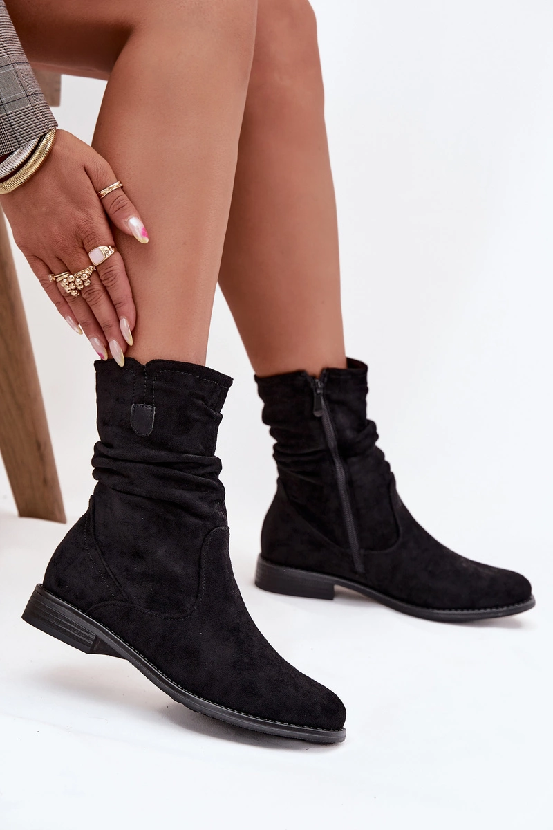 Ocieplane Botki Damskie Z Marszczoną Cholewką Na Płaskim Obcasie Czarne Krisia