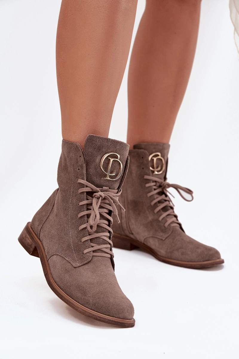 Zazoo 2955 Zamszowe Botki Workery Ze Złotym Detalem Na Języku Ciemnobeżowe