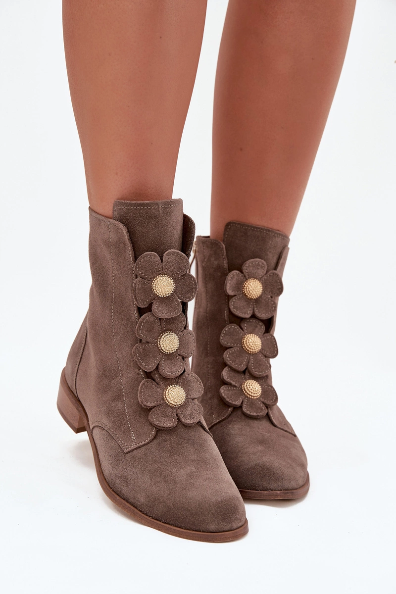 Zamszowe Botki Damskie Z Ozdobnymi Kwiatkami Zazoo 3085 Ciemnobeżowe