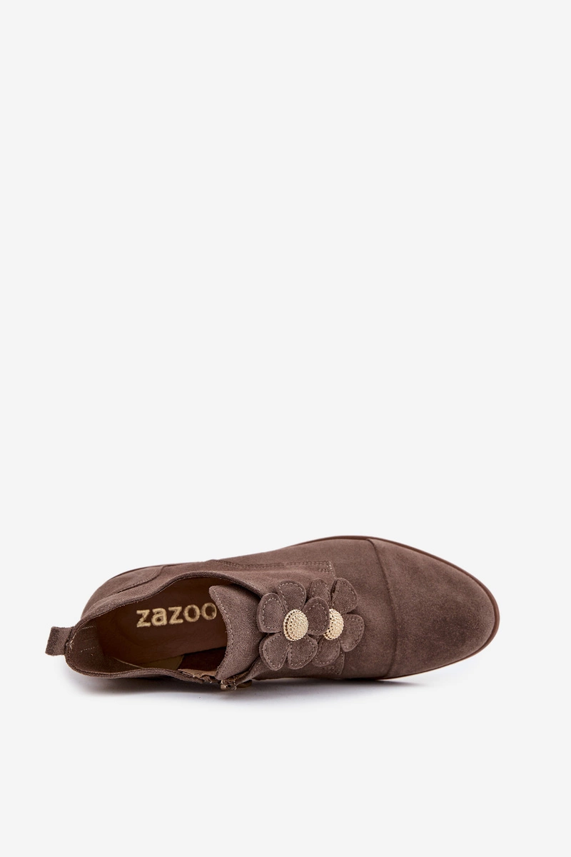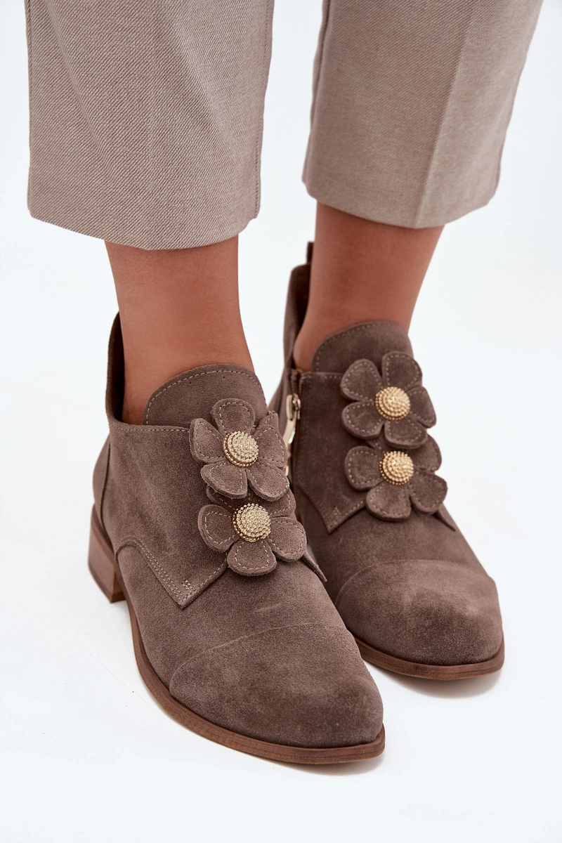 Zamszowe Półbuty Damskie Z Ozdobnymi Kwiatkami Zazoo 3080 Ciemnobeżowe
