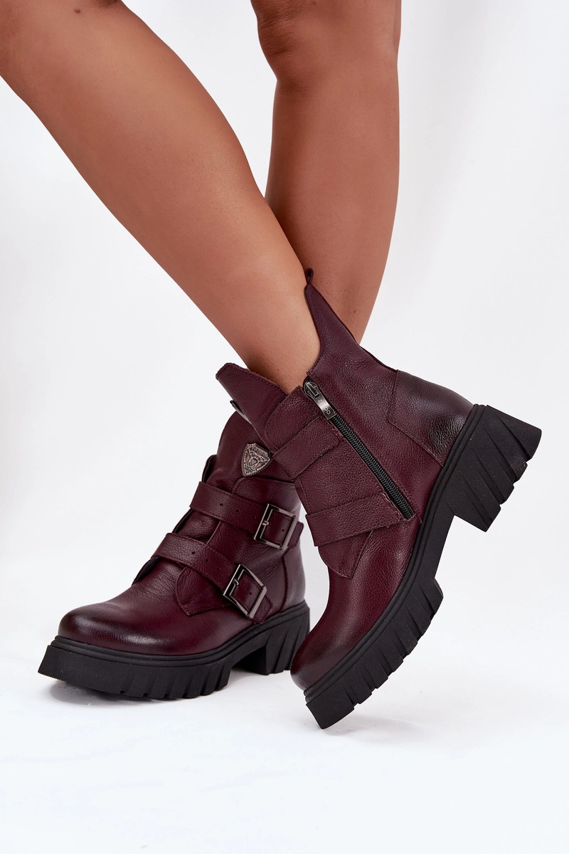 Skórzane Ocieplane Botki Damskie Z Klamrami I Ozdobnym Detalem Zazoo 60482 Bordowe
