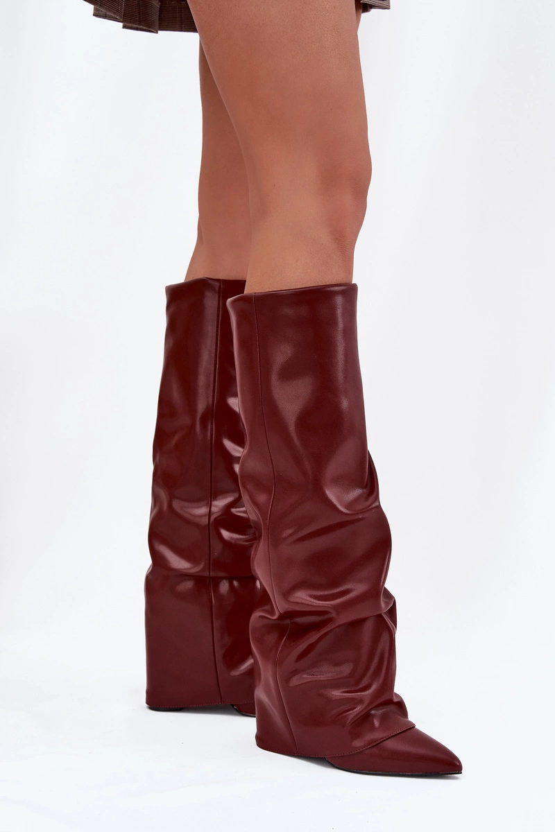 Ocieplane Kozaki Damskie Z Wywiniętą Cholewką Na Słupku Bordowe Elivira